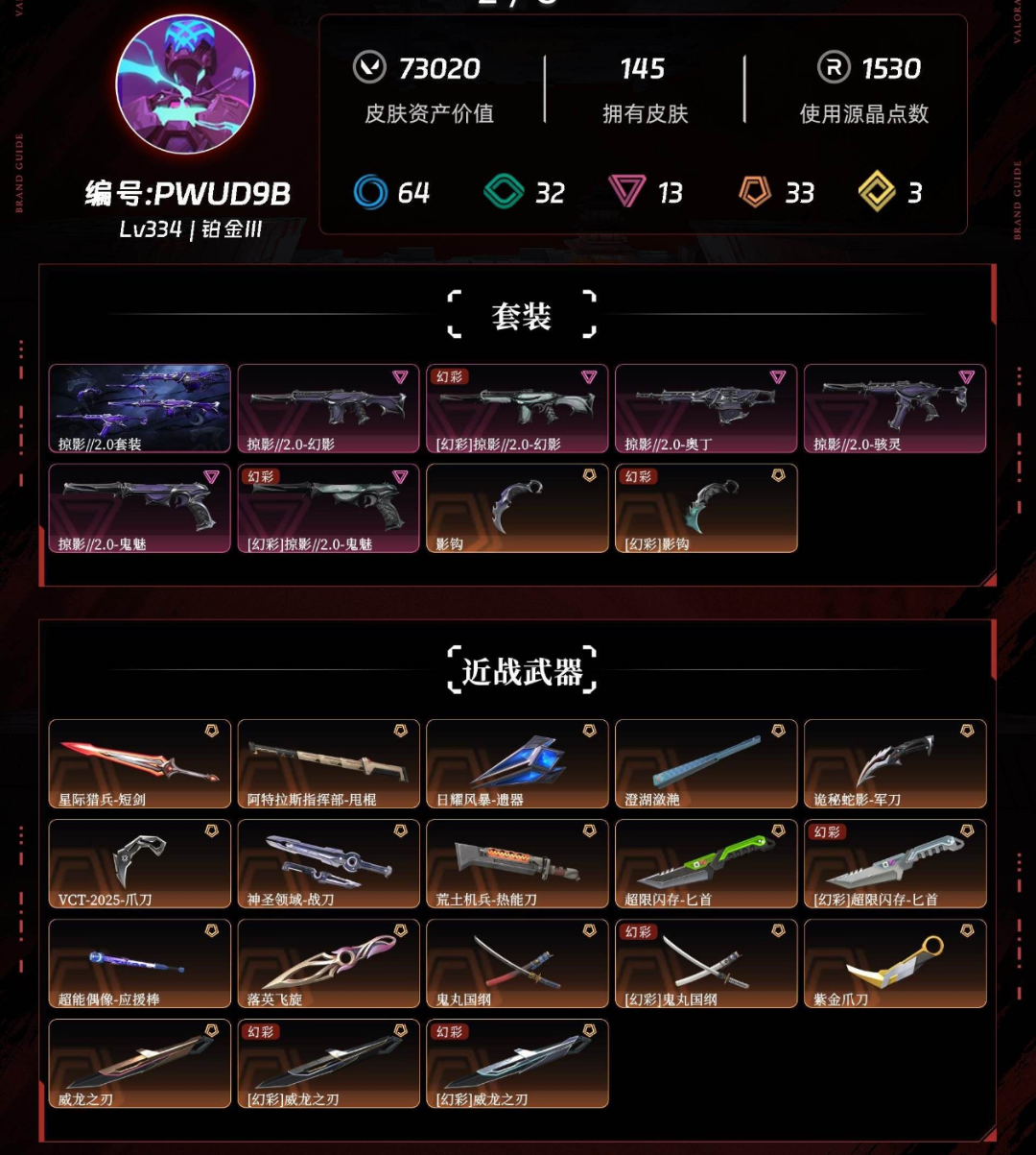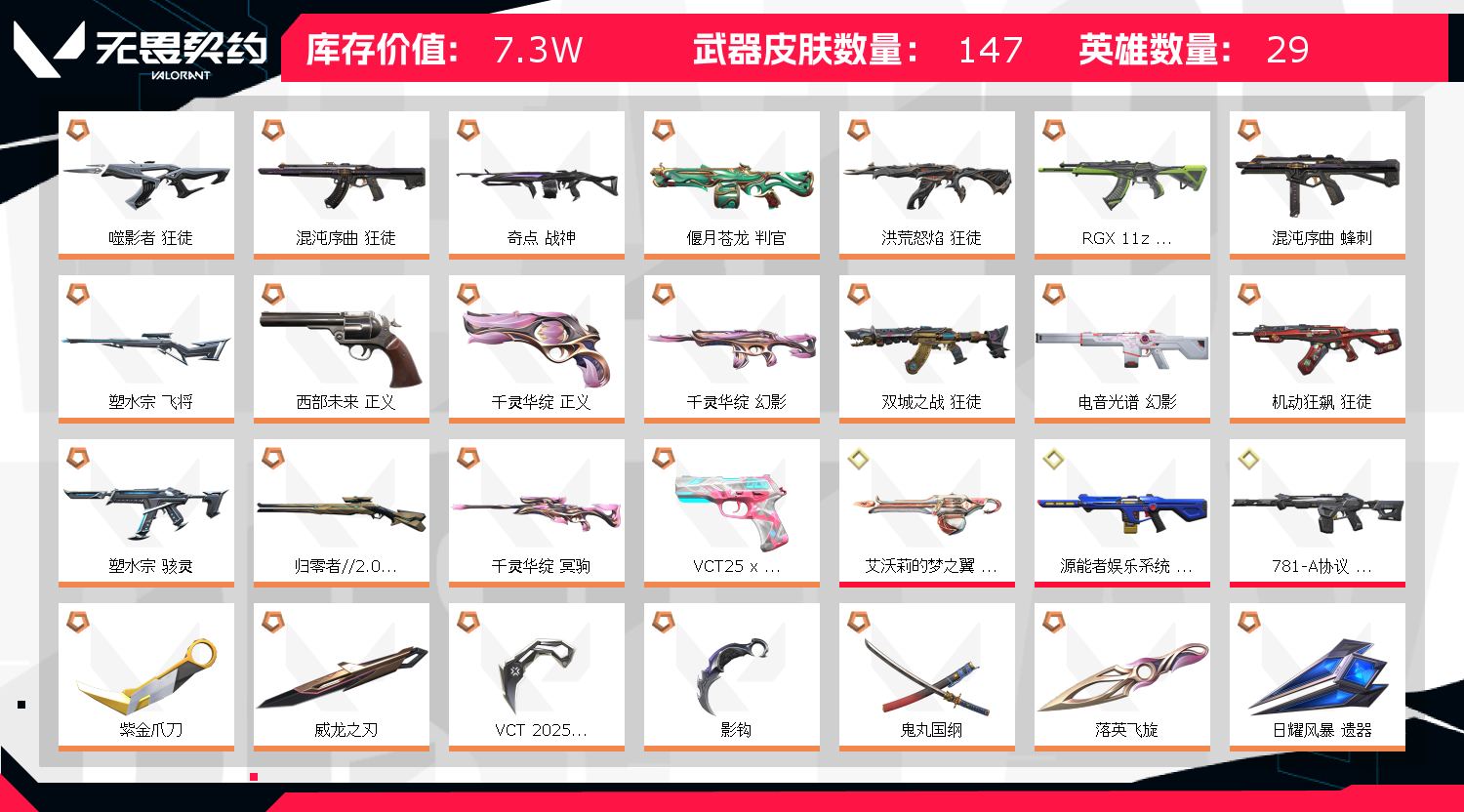 首页 > 租号大厅 > 无畏契约-wegame > wegame/wegame > 7.3W库存精品号✨25爪刀✨25VCT✨掠影2.0套✨其他全单买精品✨武士刀 ✨威龙✨莲花