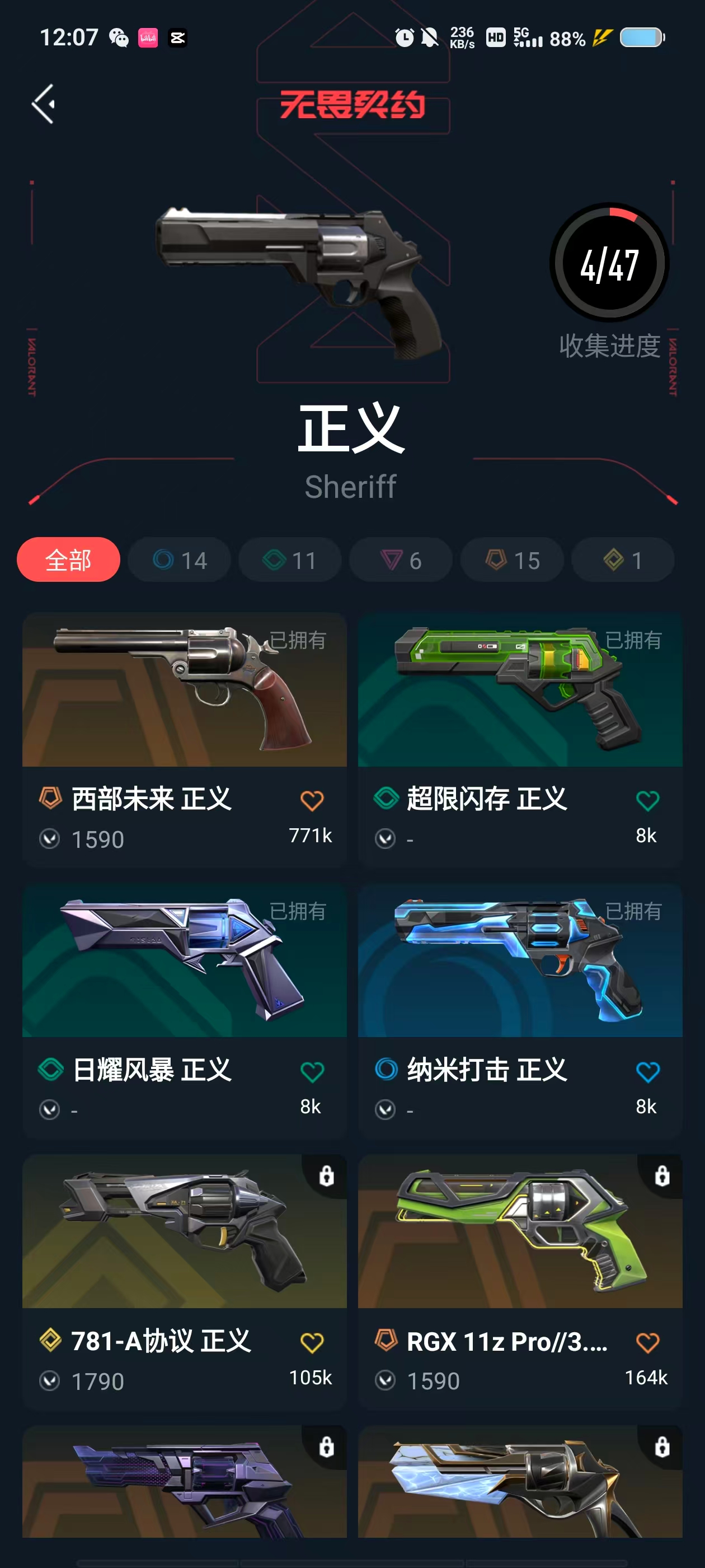 拥有多款高人气皮肤,包括正义(西部未来等)、狂徒(盖亚的复仇等)、幻影(千灵华绽,侦查等)、近战武器