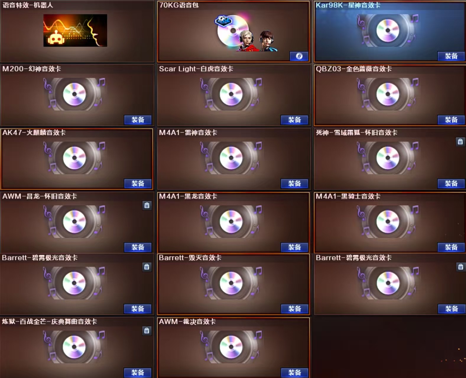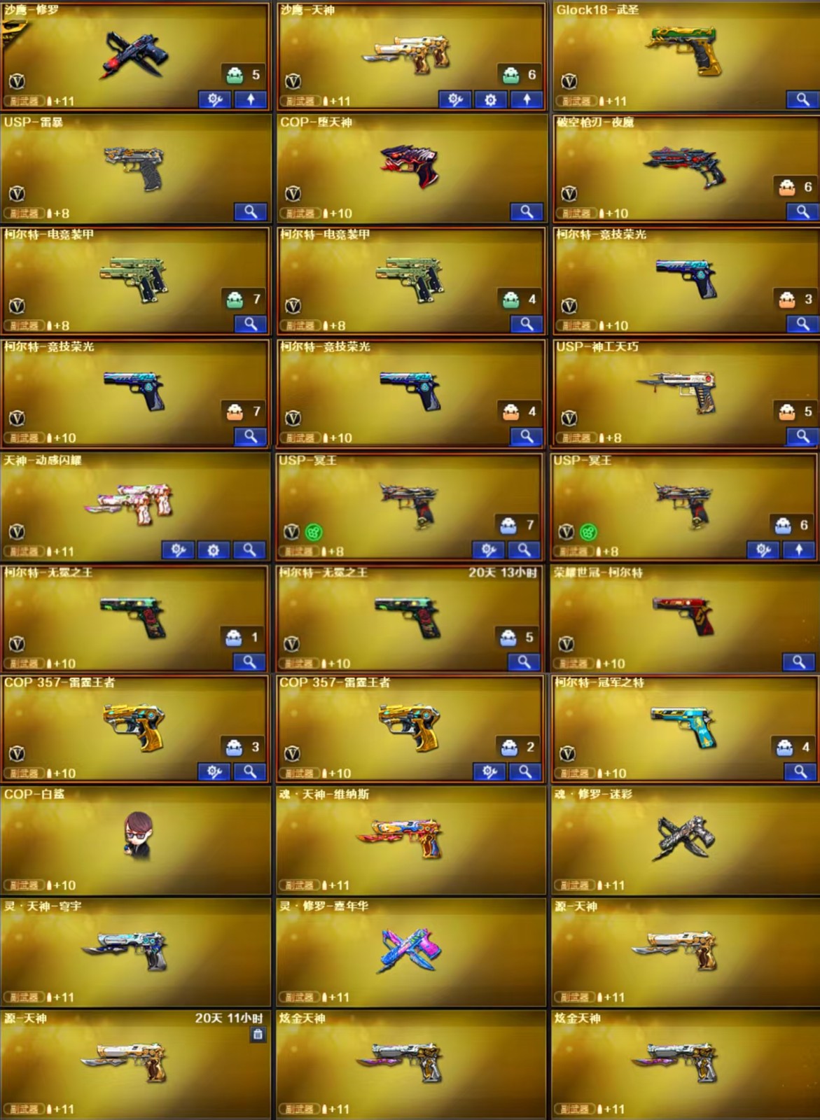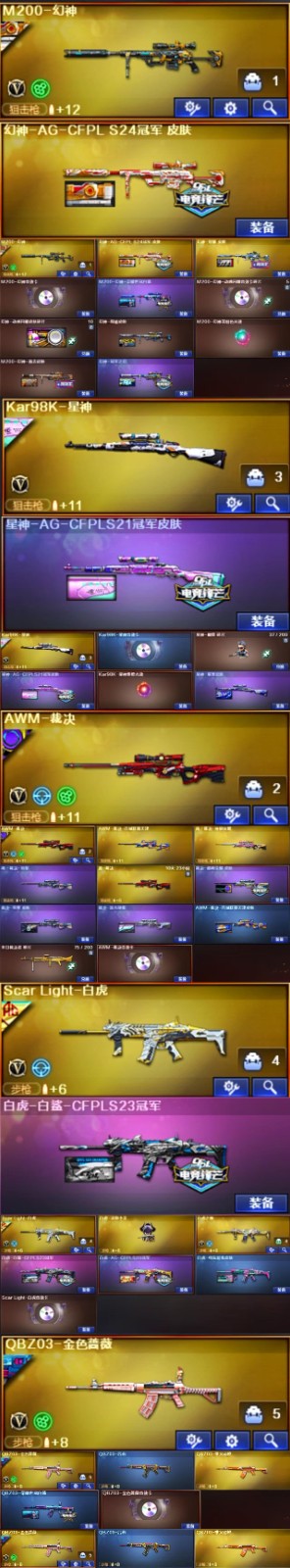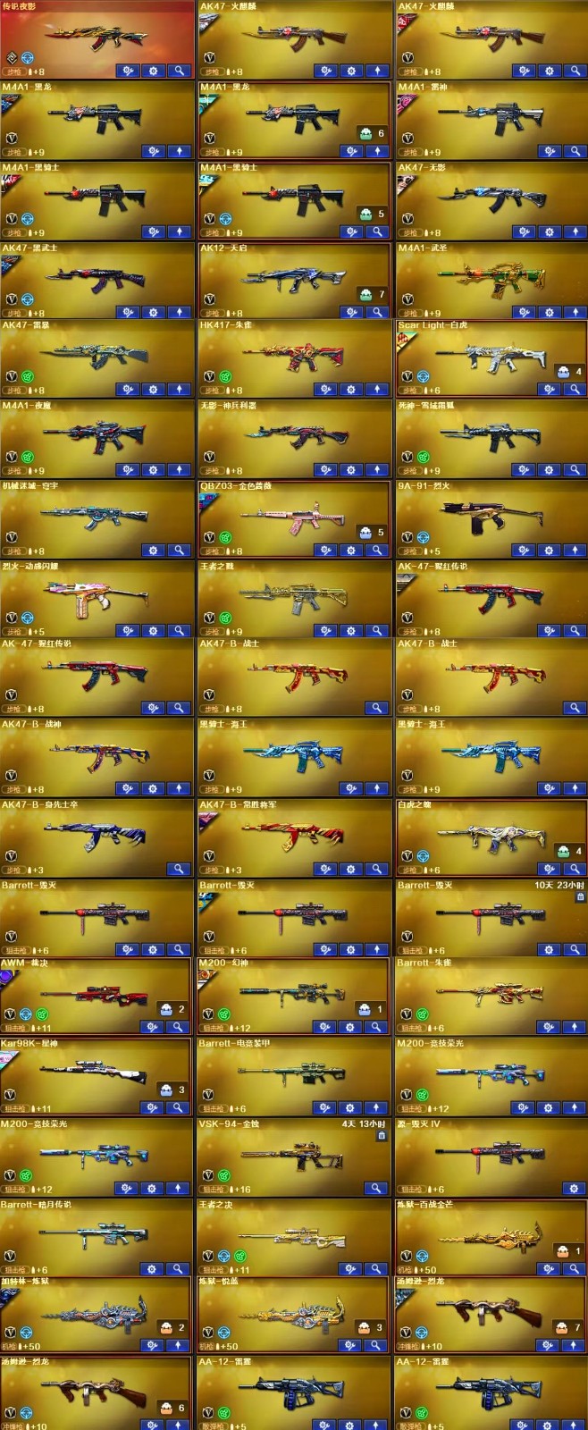 【王者武器】:【炫金火麒麟-1,王者玉锋-1,王者之魄高爆手雷-1,高爆手雷-雷霆王者-4,王者之魄闪光弹-1,COP 357-雷霆王者-觉醒版-2,炼狱-悦蓝-觉醒版-1,烟雾弹-雷霆王者-觉醒版-3,王者之决-觉醒版-1,王者之击-觉醒版-1,王者之啸-觉醒版-1,王者之戮-觉醒版-1,王者之锋-觉醒版-1,闪光弹-雷霆王者-觉醒版-4,炫金骑士-1,炫金天神-2】 【英雄武器】:【AK12-天启-1,M4A1-武圣-1,M4A1-黑骑士-2,AK47-黑武士-1,屠龙-3,龙啸-1,AK47-无影-1,麒麟刺-1,AK47-火麒麟-2,Barrett-毁灭-2,汤姆逊-烈龙-2,沙鹰-修罗-1,加特林-炼狱-1,沙鹰-天神-1,Glock18-武圣-1,M4A1-雷神-1,M4A1-黑龙-2,9A91-烈火-1,M200-幻神-1,USP-雷暴-1,高爆手雷-雷暴-7,闪光弹-雷暴-7,烟雾弹-雷暴-7,斩神刀-雷暴-1,Barrett-电竞装甲-1,M200-竞技荣光-2,传说夜影-1,尼泊尔-电竞装甲-2,恶棍-电竞装甲-7,擎天-竞技荣光-1,柯尔特-冠军之特-1,机械迷城-穹宇-1,柯尔特-电竞装甲-2,柯尔特-竞技荣光-3,烟雾弹-电竞装甲-7,烟雾弹-竞技荣光-3,闪光弹-电竞装甲-7,闪光弹-竞技荣光-3,高爆手雷-竞技荣光-4,M4A1-夜魔-1,Scar Light-白虎-1,破空枪刃-夜魔-1,USP-神工天巧-1,高爆手雷-神工天巧-5,闪光弹-神工天巧-6,唐刀-神工天巧-2,AK-47-猩红传说-2,无影-神兵利器-1,烟雾弹-神工天巧-6,AA-12-雷霆-2,Barrett-暗月传说-1,QBZ03-金色蔷薇-1,USP-冥王-2,烟雾弹-玄豹-4,HK417-朱雀-1,烈火-动感闪耀-1,手雷-动感闪耀-1,天神-动感闪耀-1,屠龙-动感闪耀-1,柯尔特-无冕之王-1,Kar98K-星神-1,闪光弹-云龙-1,擎天-1,COP-堕天神-1,AWM-裁决-1,高爆手雷-堕天神-5,龙啸-堕天神-3,麒麟刺-堕天神-1,闪光弹-堕天神-5,烟雾弹-堕天神-5,AK47-雷暴-1,AK47-B-常胜将军-1,AK47-B-身先士卒-1,荣耀世冠-柯尔特-1,黑骑士-海王-2,龙啸-烈火龙威-1,AK47-B-战神-1,AK47-B-战士-2,Barrett-朱雀-1】 【装饰品】:【火麒麟-CF STAR-1,天龙-CF STAR-1,修罗-CF STAR-1,黑龙-暗月-1,雷神-暗月-1,黑骑士-暗月-1,毁灭-暗月-1,无影-能量核心-1,游泳喵-1,王者刀锋玩偶-1,雷神-宇航兔皮肤-1,雷神-R.LGD-CFPLS18冠军-1,毁灭-冠军之怒-1,雷神-宠儿-2019MVP-1,哪吒玩偶-1,M4A1-千变-孔明皮肤-1,火麒麟-平天大圣-1,M4A1-黑龙-361-1,幸运鼠玩偶-1,火麒麟-百城-1,AK47-黑武士-361-1,雷神-虎将-1,火麒麟-心动糖果-1,黑骑士-幻能朋克 皮肤-1,火麒麟-轻羽皮肤-1,黑骑士-AG-S4冠军典藏-1,黑骑士耀金皮肤-1,雷神-星空-1,毁灭-星空-1,关羽玩偶-1,黑骑士-冠军之势-1,火麒麟玩偶-1,白虎-AG-CFPLS20冠军-1,炼狱-月 皮肤-1,白虎-电玩粉兔皮肤-1,QBZ03-荣耀世冠白鲨-1,毁灭-黑曼巴 皮肤-1,幻神-星耀 皮肤-1,死神-机甲核心皮肤-1,AK47-B-常胜将军-曹操-1,AK47-B-常胜将军-孙权-1,孙悟空玩偶-1,屠龙-荣耀之锋-1,毁灭-荣耀之怒-1,烈龙-星空-1,M200-幻神-荣耀世冠白鲨-1,幻神-冠军之幻-1,幻神-周瑜皮肤-1,星神-璀璨皮肤-1,炼狱-玩具枪皮肤-1,屠龙-星火燎原-1,麒麟刺-荣耀世冠白鲨-1,麒麟刺-萌杀皮肤-1,毁灭-墨兰 皮肤-1,毁灭-纸鸢皮肤-1,修罗-百战金芒皮肤-1,毁灭-黑大圣皮肤-1,裁决-流光秘银-1,白虎-白鲨-CFPLS23冠军-1,无影-霓裳皮肤-1,雷神-维纳斯皮肤-1,炼狱-电子连击 皮肤-1,毁灭-梦蝶 皮肤-1,毁灭-巅峰荣耀 皮肤-1,裁决-羽掣 皮肤-1,雷神-冠军之魄-1,幻神-AG-CFPL S24冠军 皮肤-1,龙啸-冠军之啸-1,裁决-巅峰荣耀 皮肤-1,CFS 击杀图标-1,毁灭-SV-CFPLS16冠军-1,黑龙-墨子皮肤-1,零-水下丽影玩偶-1,白泽玩偶-1,M200-幻神-黄忠皮肤-1】 【角色】:【魅影,金戈,樱,堕天使,复仇者,幻影,雷霆-β,飞虎队,猎狐者,刀锋,夜玫瑰,活力灵狐,兰,灵狐者,传说女帝,春,嘉年华灵狐,潘多拉-锋芒精英,木兰,游珑儿,雪莉杨-摸金校尉,灵狐者-黄金海岸,电竞教官-云悠悠,雨棠,王者涂鸦,夜玫瑰-宠粉,王者葵-惊若翩鸿,圣诞潘多拉-X,陈龙野,陈龙野-Y,精英部队,烈锋,斯沃特精英,空,代号:翼,潘多拉-甜心教官,虎妞,娟娟,紫霞,斯沃特-锋芒精英,潜龙队-X,剑齿虎,麻雀,王者樱-热浪之夏,智影,维纳斯,兔囡囡,陈龙野-Z,芳心审判者,曼陀罗-礼服,社长刀锋,沃特-X,暗夜-X,迷迭香,沙漠玫瑰,灵狐者-职业经理,樱-青春偶像,职业选手,王者炫,猎狐者-追月,灵狐-花神,甜心偶像】 【道具】:【超级背包-1,炫彩背包-1,烟雾保护头盔-1,闪光护目镜-1,防弹衣-1,防弹头盔-1,手雷包-1,防化服-1,夺命之镰-1,灵魂忍者-1,妖姬-1,疯狂宝贝-1,迷雾幽灵-1,生化弹匣-1,步枪弹匣-1,冲锋枪弹匣-1,手枪弹匣-1,皇龙戒-1,彩蝶之翼-1,Barrett-毁灭音效卡-1,M4A1-雷神音效卡-1,AK47-火麒麟音效卡-1,M4A1-黑骑士音效卡-1,M200-幻神音效卡-1,M4A1-黑龙音效卡-1,云山科技背包-1,听风战术耳机-1,智眸战术目镜-1,小萝莉-1,QBZ03-金色蔷薇音效卡-1,Scar Light-白虎音效卡-1,天使之翼-1,绿色巨人-1,黄金头骨护目镜-1,天使光环-1,兔子发带-1,Kar98K-星神音效卡-1,AWM-裁决音效卡-1,大圣头盔-1】;USP-雷暴,柯尔特-无冕之王,荣耀世冠-柯尔特,柯尔特-冠军之特,Knife-冠军之刃,沙漠玫瑰,传说女帝,