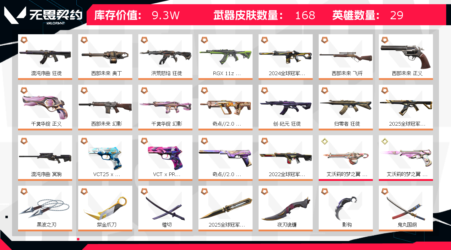9.5W库存+2000R点❤25/22/24冠军套神中神西部套❤18狂徒黑波镭切20刀❤莲花10幻影;艾沃莉的梦之翼 奥丁,西部未来 奥丁,黑波之刃,紫金爪刀,镭切,盖亚的复仇 狂徒,洪荒怒焰 狂徒,