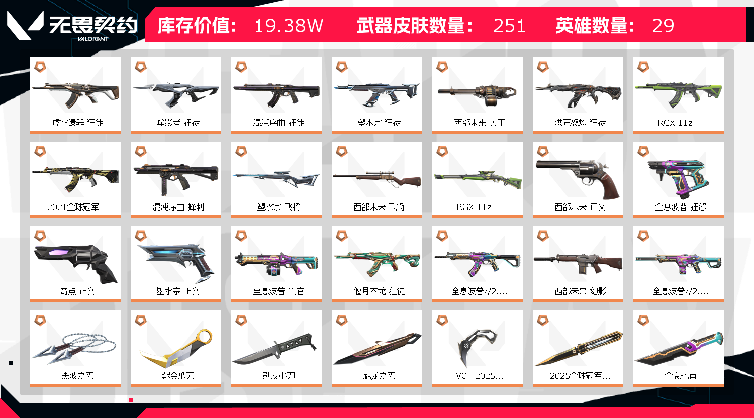 【卡面信息】情人节捷风卡面,九命灵猫卡面,VCT2025CN联赛卡面,情人节猎枭卡面,西部未来卡面,先驱者卡面,布鲁诺中校卡面,分崩离析卡面,我眼中的世界卡面,双城之战拥抱卡面,捣蛋鬼出卡面,神射卡面,RGX11zPro30卡面,超能偶像卡面,VCTxLEV卡面,耀鳞威龙卡面,逆向独行卡面,;西部未来 奥丁,黑波之刃,紫金爪刀,剥皮小刀,威龙之刃,VCT 2025 爪刀,盖亚的复仇 狂徒,