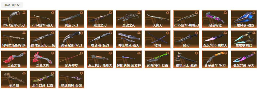 【拥有近战武器】阿特拉斯指挥部-甩棍,日耀风暴-遗器,诡秘蛇影-军刀,神圣领域-战刀,荒土机兵-热能刀,超限闪存-匕首,超能偶像-应援棒,珍珠棘贝-短剑,钢轨卫士-战锤,沙尘幻旅-匕首,弧光异彩-军刀,合金战车-军刀,金角扇,剥皮小刀,盖亚之愠,
