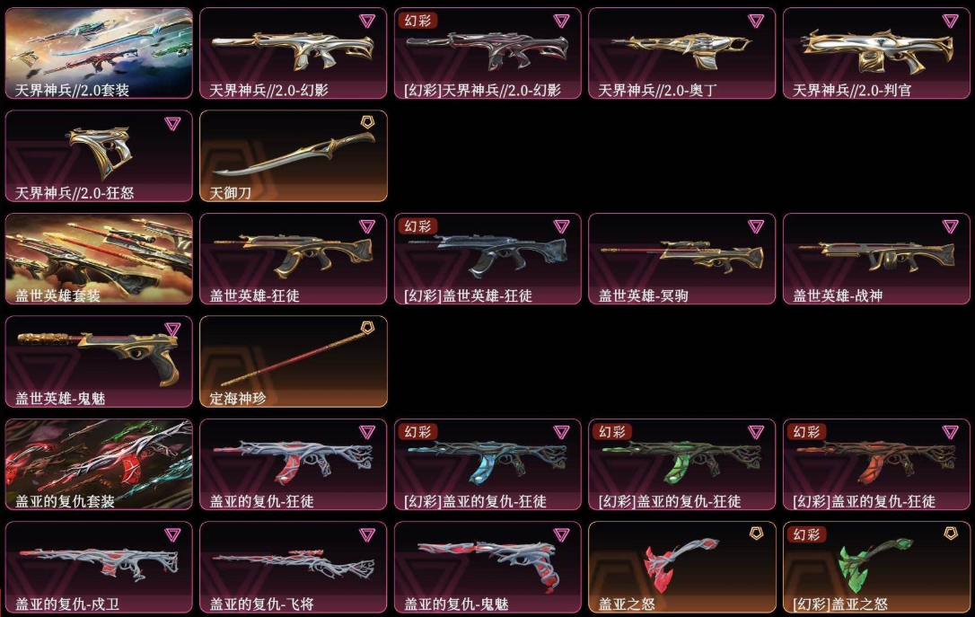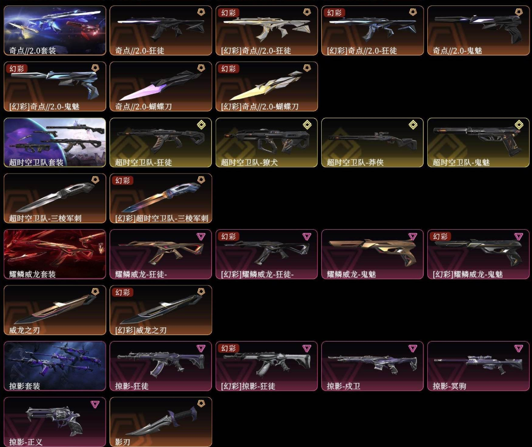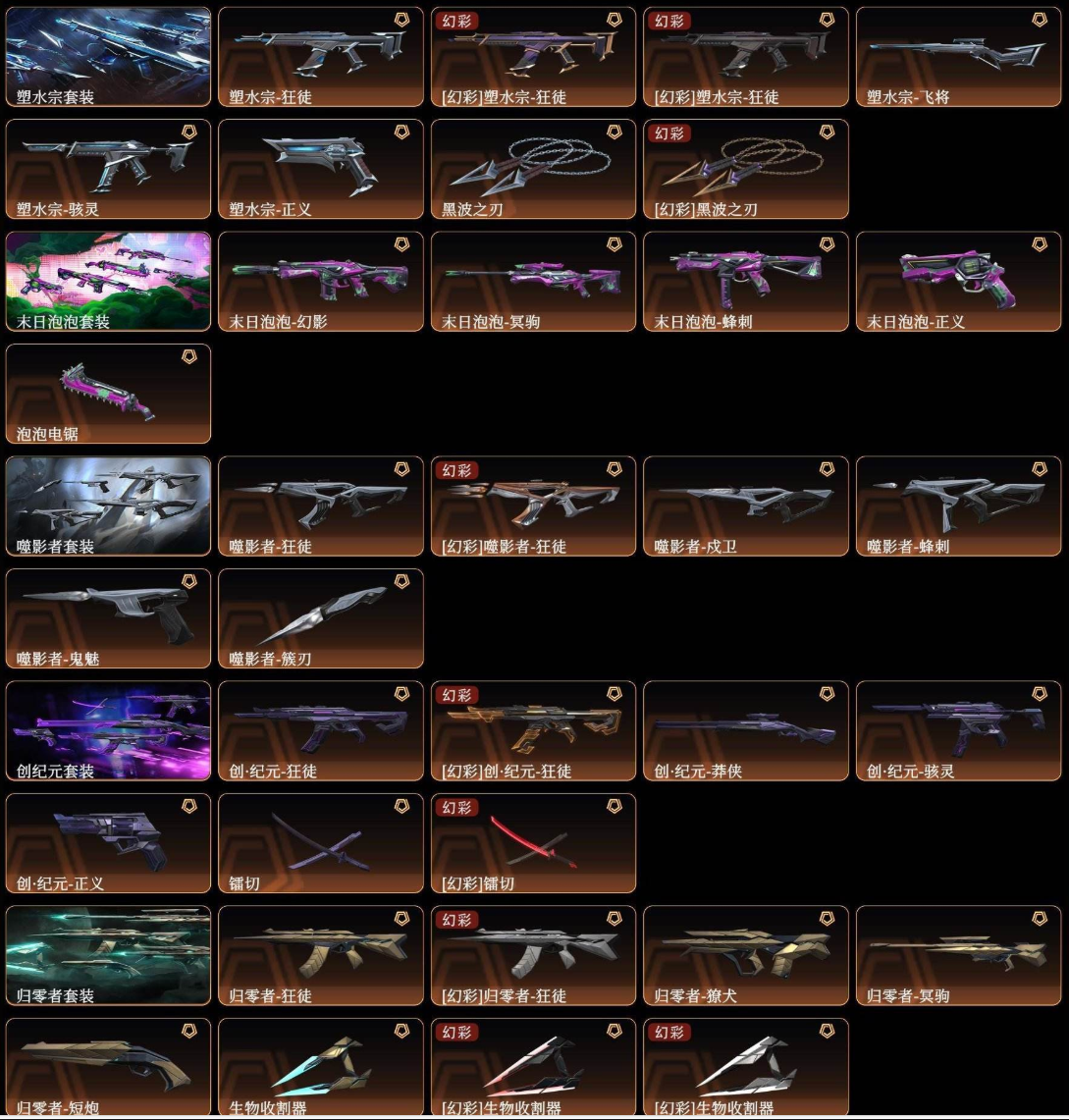 )2024全球冠军赛套装(2024全球冠军赛-幻影,2024全球冠军赛-战刀)2021全球冠军赛套装(2021全球冠军赛-狂徒,2021全球冠军赛-爪刀)归零者套装(归零者-獠犬,归零者-狂徒,归零者-冥驹,归零者-短炮,生物收割器)天界神兵2.0套装(天界神兵//2.0-幻影,天界神兵//2.0-奥丁,天界神兵//2.0-判官,天界神兵//2.0-狂怒,天御刀)盖世英雄套装(盖世英雄-狂徒,盖世英雄-冥驹,盖世英雄-战神,盖世英雄-鬼魅,定海神珍)盖亚的复仇套装(盖亚的复仇-狂徒,盖亚的复仇-戍卫,盖亚的复仇-飞将,盖亚的复仇-鬼魅,盖亚之怒)耀鳞威龙套装(耀鳞威龙-狂徒,耀鳞威龙-鬼魅,威龙之刃)掠影套装(掠影-狂徒,掠影-冥驹,掠影-戍卫,掠影-正义,影刃)