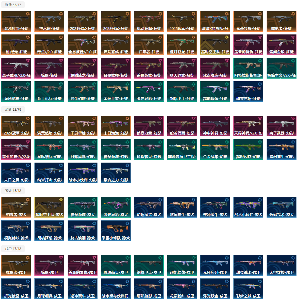 【拥有步枪】滋滋X特攻队-狂徒,光荣异象-狂徒,混沌序曲-狂徒,千灵华绽-幻影,洪荒怒焰-幻影,洪荒怒焰-狂徒,全息波普//2.0-狂徒,机动狂飙-狂徒,2023全球冠军赛-狂徒,偃月苍龙-狂徒,神中神罚-幻影,离子武器//2.0-狂徒,堕天遗武-狂徒,紫阙金琅-狂徒,盖亚的复仇//2.0-幻影,侦察力量-幻影,冰点凝冻-狂徒,般若假面-幻影,离子武器-幻影,日冕雄师-狂徒,星际猎兵-幻影,阿特拉斯指挥部-狂徒,日耀风暴-幻影,极简主义//2.0-狂徒,诡秘蛇影-狂徒,神圣领域-獠犬,神圣领域-幻影,荒土机兵-狂徒,超限闪存-幻影,超能偶像-戍卫,超能偶像-狂徒,珍珠棘贝-幻影,珍珠棘贝-戍卫,钢轨卫士-狂徒,金纹世家-狂徒,钢轨卫士-戍卫,沙尘幻旅-狂徒,噬源兽防卫工程-幻影,弧光异彩-獠犬,弧光异彩-狂徒,合金战车-幻影,瑰梦艺语-狂徒,光环序列-戍卫,悠闲猫生-幻影,太空穿梭-戍卫,悠闲猫生-獠犬,幻语魔咒-獠犬,甜蜜战术-戍卫,末日之翼-幻影,折光棱晶-戍卫,月球哨兵-戍卫,纳米-幻影,逆冲蛮牛-戍卫,逆冲蛮牛-獠犬,模拟赫兹-獠犬,浮光跃金-戍卫,聚合之力-幻影,采蜜小蜂队-獠犬,战术熊与伙伴们-戍卫,复古浪潮-獠犬,战术小伙伴-獠犬,战术小伙伴-幻影,萌彩剪影-戍卫,胡桃狂想-獠犬,彩梦之城-戍卫,数码咒术-獠犬,花漾粉红-戍卫,