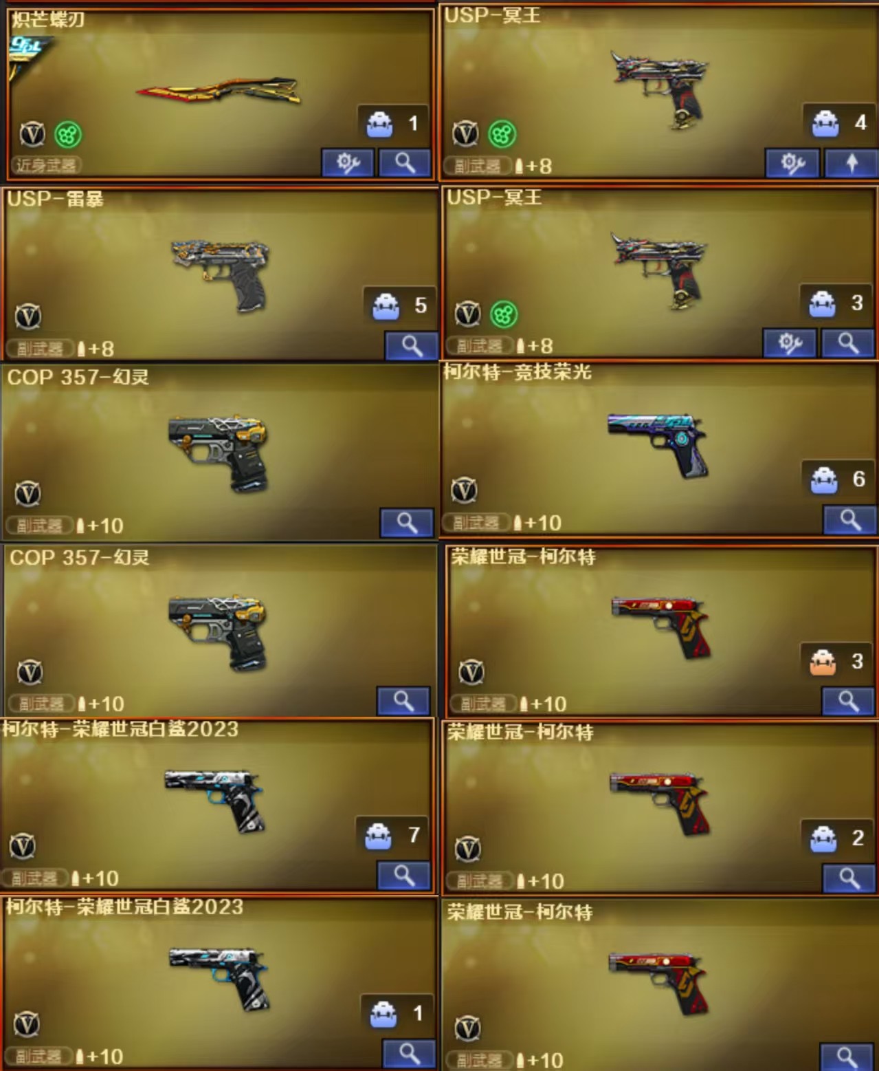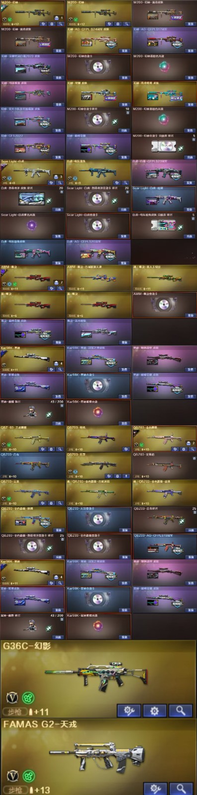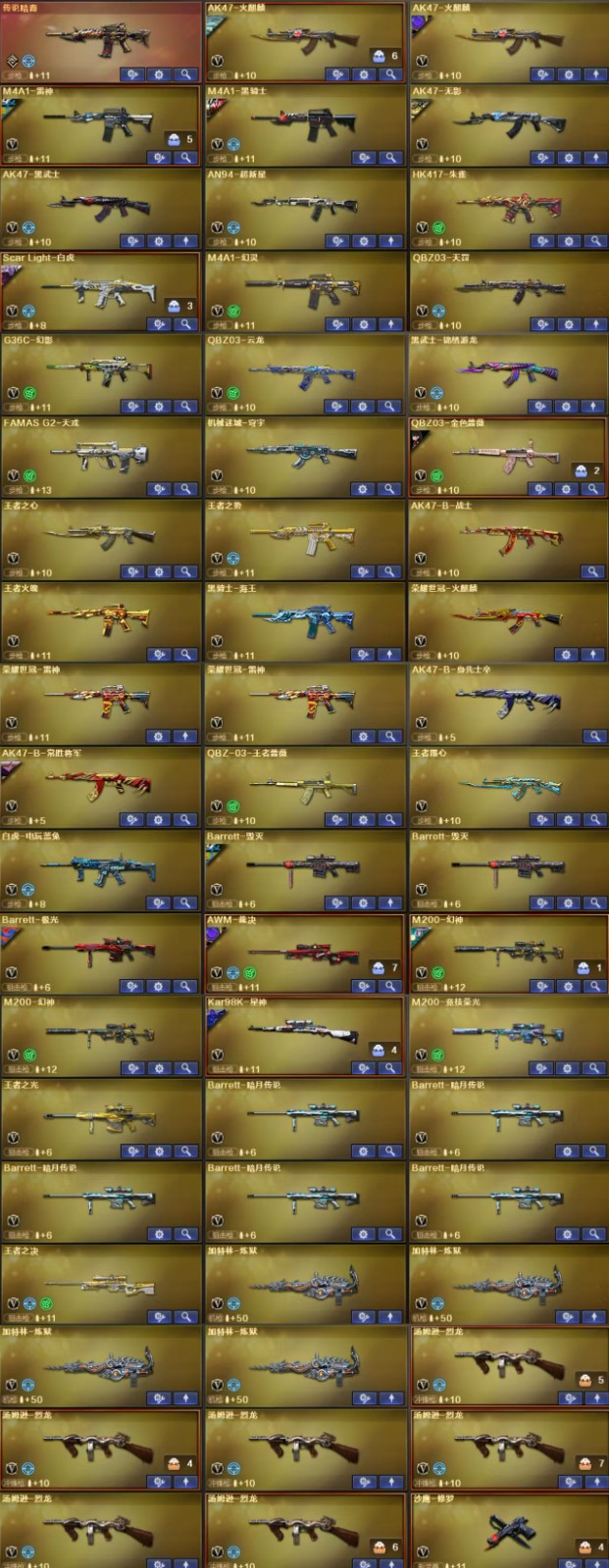 【王者武器】:【炫金雷神-1,QBZ-03-王者蔷薇-觉醒版-1,王者之光-觉醒版-1,王者之决-觉醒版-1,王者之击-觉醒版-1,王者之势-觉醒版-1,王者之啸-觉醒版-1,王者之心-觉醒版-1,王者之灵-觉醒版-1,王者之锋-觉醒版-1,王者之魂-觉醒版-1,王者霜心-1,炫金骑士-1,炫金千变-1】 【英雄武器】:【AN94-超新星-1,M4A1-黑骑士-1,AK47-黑武士-1,屠龙-3,龙啸-1,AK47-无影-1,AK47-火麒麟-2,Barrett-毁灭-2,汤姆逊-烈龙-6,Barrett-极光-1,沙鹰-修罗-1,加特林-炼狱-4,沙鹰-天神-1,M4A1-雷神-1,M200-幻神-2,USP-雷暴-1,M200-竞技荣光-1,幻灵之锋-2,擎天-竞技荣光-1,机械迷城-穹宇-1,柯尔特-竞技荣光-1,烟雾弹-竞技荣光-1,白虎-电玩蓝兔-1,闪光弹-竞技荣光-1,高爆手雷-竞技荣光-1,Scar Light-白虎-1,传说暗裔-1,炽芒蝶刃-1,Barrett-暗月传说-5,QBZ03-金色蔷薇-1,FAMAS G2-天戎-1,USP-冥王-2,HK417-朱雀-1,G36C-幻影-1,QBZ03-天罚-1,柯尔特-荣耀世冠白鲨2023-2,QBZ03-云龙-1,Kar98K-星神-1,黑武士-锦绣游龙-1,手雷-热带奇洋-1,擎天-1,AWM-裁决-1,AK47-B-常胜将军-1,AK47-B-身先士卒-1,COP 357-幻灵-2,M4A1-幻灵-1,烟雾弹-幻灵-9,荣耀世冠-柯尔特-3,荣耀世冠-火麒麟-1,荣耀世冠-雷神-2,荣耀世冠-龙啸-1,闪光弹-幻灵-7,高爆手雷-幻灵-7,黑骑士-海王-1,AK47-B-战士-1】 【装饰品】:【火麒麟-CF STAR-1,天龙-CF STAR-1,修罗-CF STAR-1,极光-能量核心-1,DJ喵-1,游泳喵-1,炽芒蝶刃-荣耀世冠白鲨2023 皮肤-1,幻神-荣耀世冠白鲨2023 皮肤-1,金色幸运鼠玩偶-1,雷神-宇航兔皮肤-1,雷神-R.LGD-CFPLS18冠军-1,AK47-火麒麟-传奇EVEN-1,传奇石头-横秒之巅-1,火麒麟-荣耀世冠AG-1,火麒麟-百城-1,火麒麟-巅峰荣耀-1,火麒麟-心动糖果-1,黑骑士-AG-S4冠军典藏-1,无影耀金皮肤-1,毁灭-星空-1,关羽玩偶-1,雷神-耀金皮肤-1,Scar Light-白虎-暗星-1,白虎-AG-CFPLS20冠军-1,白虎-电玩粉兔皮肤-1,QBZ03-AG-CFPLS19冠军-1,屠龙-星耀 皮肤-1,幻神-星耀 皮肤-1,战神-粉色甜心皮肤-1,战神-紫绶金章皮肤-1,AK47-B-常胜将军-曹操-1,火麒麟-AG战队皮肤-1,AK47-B-常胜将军-刘备-1,AK47-B-常胜将军-孙权-1,屠龙-荣耀之锋-1,雷神-荣耀之魄-1,毁灭-荣耀之怒-1,幻神-星火小队签名臻藏版 皮肤-1,幻神-CFS2022-1,幻神-巅峰荣耀-1,幻神-AG-CFPLS17冠军-1,星神-璀璨皮肤-1,屠龙-荣耀世冠AG-1,麒麟刺-荣耀世冠白鲨-1,毁灭-风暴-1,裁决-流光秘银-1,M4A1-雷神-拼搏-1,QBZ03-金色蔷薇-拼搏-1,白虎-白鲨-CFPLS23冠军-1,黑骑士-破界 皮肤-1,金色蔷薇-破浪逐光 皮肤-1,星神-巅峰荣耀 皮肤-1,炽芒蝶刃-冠军炽芒皮肤-1,雷神-冠军之魄-1,幻神-AG-CFPL S24冠军 皮肤-1,星神-黯钢战甲 皮肤-1,裁决-巅峰荣耀 皮肤-1,CFS 击杀图标-1,毁灭-SV-CFPLS16冠军-1,雷神-传奇N9-1,王胖子玩偶-1,白泽玩偶-1,屠龙-破浪逐光 皮肤-1,M200-幻神-黄忠皮肤-1】 【角色】:【金戈,堕天使,复仇者,幻影,猎狐者,兰,夏日之兰,传说女帝,嘉年华灵狐,潘多拉-锋芒精英,游珑儿,荒漠琉璃,电竞教官-云悠悠,影豹,王者沙漠玫瑰,王者涂鸦,王者玲珑-小乔,圣诞潘多拉-X,风暴女,精英部队,烈锋,猎狐者-X,猎狐者-英特尔,斯沃特精英,王者-零-传说之路,新娜塔莎,龙儿,0号玩家,传说星骇,王者-葵-貂蝉,兔囡囡,陈龙野-Z,芳心审判者,社长刀锋,暗夜-X,灵狐者-职业经理,职业选手】 【道具】:【超级背包-1,炫彩背包-1,烟雾保护头盔-1,闪光护目镜-1,运动护目镜-1,防弹衣-1,防弹头盔-1,手雷包-1,C4工具钳-1,防化服-1,夺命之镰-1,灵魂忍者-1,疯狂宝贝-1,迷雾幽灵-1,步枪弹匣-1,冲锋枪弹匣-1,彩蝶之翼-1,Barrett-毁灭音效卡-1,M4A1-雷神音效卡-1,AK47-火麒麟音效卡-1,M4A1-黑骑士音效卡-1,M200-幻神音效卡-1,小萝莉-1,运动护目镜-破浪十年-1,QBZ03-金色蔷薇音效卡-1,Scar Light-白虎音效卡-1,变相怪杰-1,天使之翼-1,绿色巨人-1,Kar98K-星神音效卡-1,QBZ03-天罚 音效卡-1,AWM-裁决音效卡-1】;USP-雷暴,荣耀世冠-柯尔特,柯尔特-荣耀世冠白鲨2023,炽芒蝶刃,传说星骇,传说女帝,电竞教官-云悠悠,