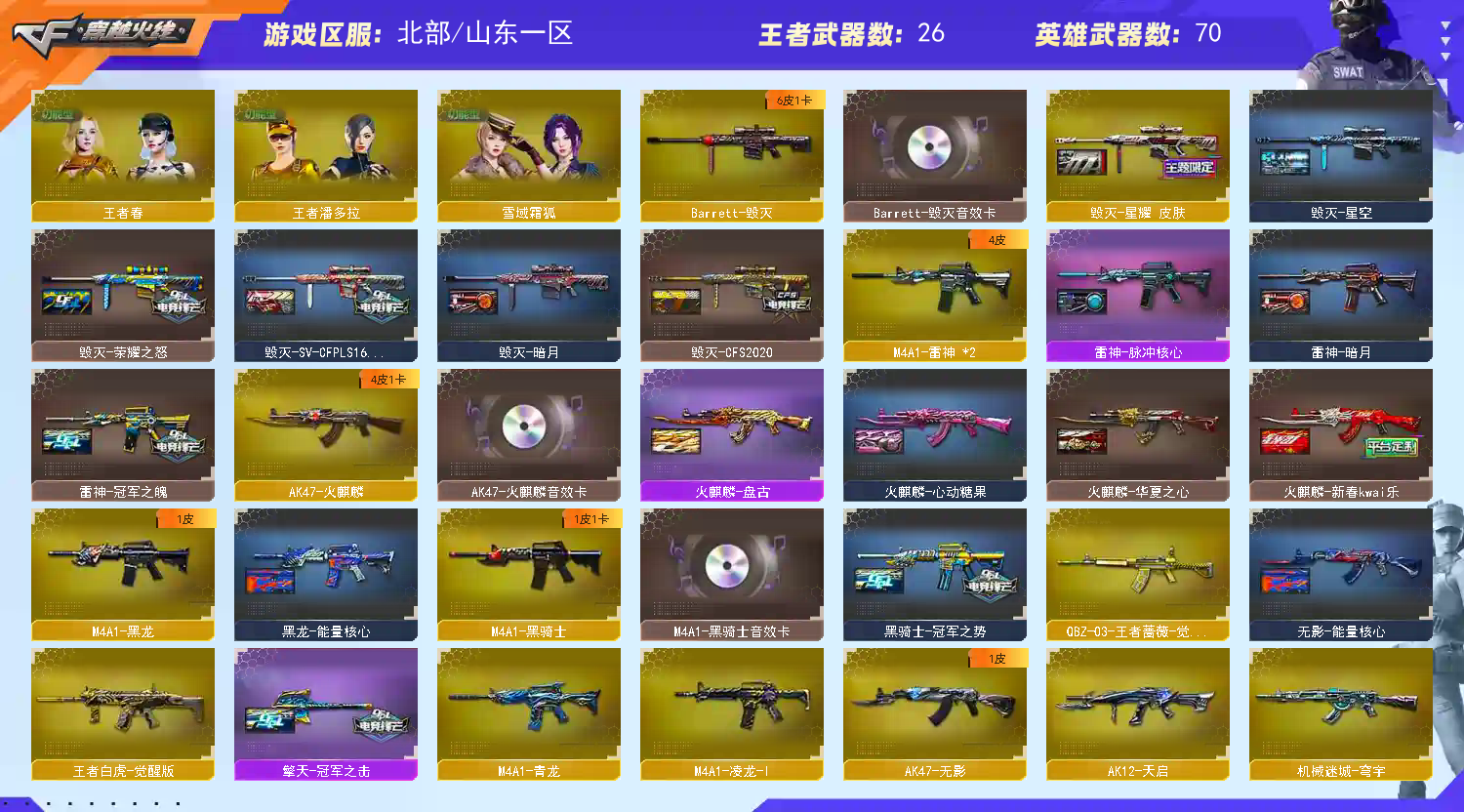 【传说幽冥】 【M200-幻神+幻神-星火小队签名臻藏版 皮肤/幻神-曹操 皮肤/幻神-丹凤/幻神-CFS2022/幻神-星耀 皮肤】【Kar98K-星神+星神-巅峰荣耀 皮肤+Kar98K-星神音效卡】【AWM-裁决+裁决-羽掣 皮肤】【Scar Light-白虎/王者白虎-觉醒版+Scar Light-白虎-暗星】【王者之魄-觉醒版/王者之心-觉醒版/QBZ-03-王者蔷薇-觉醒版】【COP 357-雷霆王者-觉醒版/沙鹰-天神(2)/沙鹰-修罗/荣耀世冠-柯尔特/柯尔特-竞技荣光/USP-雷暴/USP-冥王(2)/修罗-古蛇迷踪/柯尔特-无冕之王】【炽芒蝶刃(2)/麒麟刺/麒麟刺-堕天神/荣耀世冠-龙啸/擎天(3)/屠龙(3)/幻灵之锋/雷霆王者之锋-觉醒版/马来剑-夜魔/丛林匕首-玄豹/唐刀-古蛇迷踪】【王者霜心/天启-悦智/超新星-悦享/王者之幻/雷霆王者之锋】【雨棠/蛇隐宗/王者潘多拉/雪域霜狐/云海玲珑/斯沃特-X】【毁灭-SV-CFPLS16冠军/毁灭-CFS2020/毁灭-星空/毁灭-暗月/毁灭-星耀 皮肤/AWM-天龙-传奇白鲨//火麒麟-CFSTAR/火麒麟-华夏之心/火麒麟-心动糖果/火麒麟-盘古/火麒麟-新春kwai乐/无影-能量核心/M4A1-千变-孔明皮肤/雷神-源计划2.0专属 皮肤/雷神-冠军之魄/雷神-暗月/雷神-脉冲核心/黑骑士-冠军之势/黑龙-能量核心/炼狱-星空/修罗耀金皮肤/屠龙-荣耀之锋/屠龙-星耀 皮肤/擎天-冠军之击 】【M4A1-黑骑士音效卡/AK47-火麒麟音效卡/Barrett-毁灭音效卡/Barrett-极光音效卡】【Barrett-毁灭/M4A1-青龙/M4A1-雷神(2)/M4A1-黑龙/M4A1-龙血/M4A1-黑骑士/AK12-天启/AK47-火麒麟/AK47-无影/机械迷城-穹宇/金色蔷薇-古蛇迷踪/黑武士-锦绣游龙】;USP-雷暴,柯尔特-无冕之王,USP-雷暴王者,荣耀世冠-柯尔特,传说幽冥,炽芒蝶刃,M200-幻神,