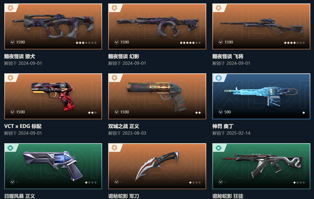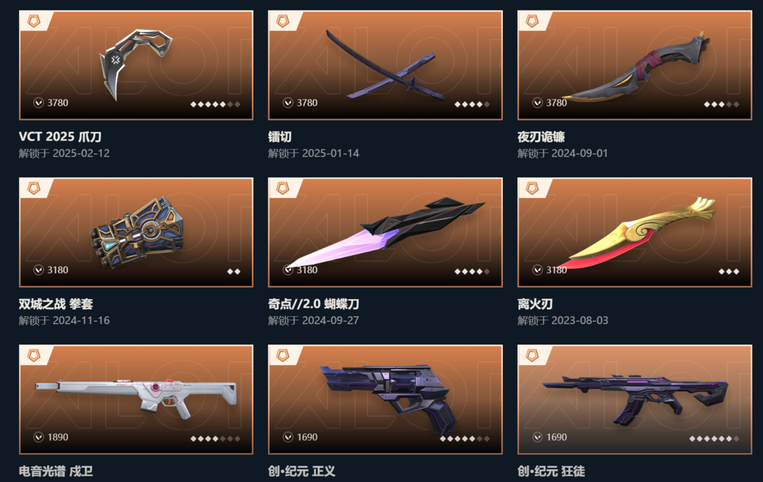 已备案11刀24橙✨离火刃✨双城之战正义/狂徒/拳套✨创纪元套✨奇点套✨黯夜怪谈套✨VCT爪刀