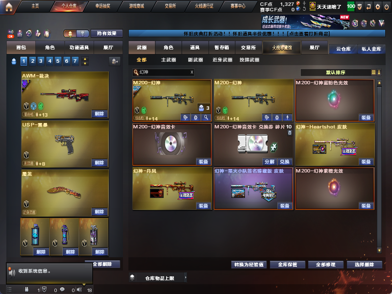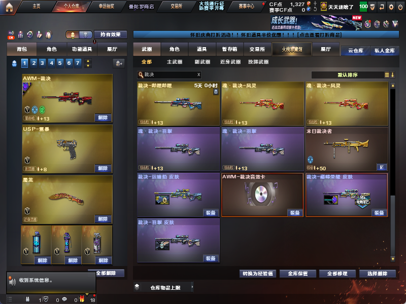 王者武器:王者凌虎;王者之击-觉醒版;王者雷影;王者风势-觉醒版;王者之魄-觉醒版;王者之魂-觉醒版;王者之幻;炫金毁灭 英雄武器:Barrett-毁灭;Barrett-碧霄极光;龙啸-烈火龙威;烟雾弹-玄豹;USP-雷暴;机械迷城-穹宇;AA-12-雷霆;柯尔特-冠军之特;柯尔特-荣耀世冠白鲨2023;M200-幻神;G36C-幻影;AWM-裁决;Kar98K-星神;雷霆之契;高爆手雷-竞技荣光;烟雾弹-竞技荣光;闪光弹-竞技荣光;柯尔特-竞技荣光;传说幽瞳;Scar Light-白虎;炽芒蝶刃;沙鹰-天神;QBZ03-金色蔷薇;沙鹰-修罗;黑武士-锦绣游龙;M4A1-龙血;RPK-盘龙;加特林-炼狱;汤姆逊-烈龙;AK12-天启;M4A1-千变;M4A1-死神;屠龙;AK47-无影;龙啸;麒麟刺;擎天;M4A1-雷神;Barrett-极光;AWM-天龙;M4A1-黑骑士;AK47-火麒麟;Barrett-毁灭 角色:零;樱;电竞教官-云悠悠;隼;猎狐者;飞虎队;刀锋;潘多拉;复仇者;堕天使;堕天使;夜玫瑰;狐影;陈龙野-Y;救世主;精英部队;灵狐者;灵狐者-黄金海岸;兰-海滩派对;
