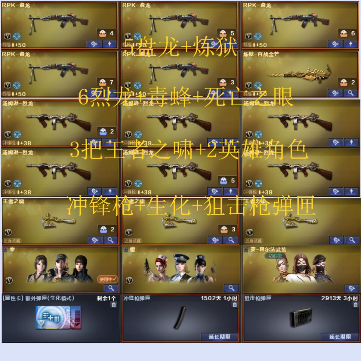 60v12王者4炫金可排位【/传说光耀/王者幻神/死亡之眼/11烈龙/5盘龙/沙鹰-修罗/猫猫手套/】【雷神音效卡/炼狱-百战金芒-庆典舞曲音效卡/】【/雷神-传奇N9/黑龙-暗月/雷神-星空/火麒麟-AG战队皮肤/】【/零/樱/王者玲珑/葵-阿尔法武装/】【/王者之心/王者之魄-觉醒版/王者之灵/王者之锋/王者之啸-觉醒版/炫金雷神/炫金千变/炫金毁灭/M4A1-雷神-精英刀锋/火麒麟-绝迹/天龙-曼陀罗/爆炎激光-超越MAX/致命乱世-超越Max/机甲撕裂者III/激光毁灭者III/KAC-青曜/KAC-圣炎切割者III/深渊巨龙咆哮III/毒刺-金线/神圣爆裂者III/试炼破坏者III/征服者-超越2/惩戒者III/】【阿尔法武装套装/战舰头盔/透明头盔/胡司令玩偶/战舰玩偶/战舰背包/A背包套装扩展券/全背包/散弹枪弹匣长时效/狙击枪弹匣长时效/永久防弹衣防弹头盔手雷包C4工具钳;RPK-盘龙,