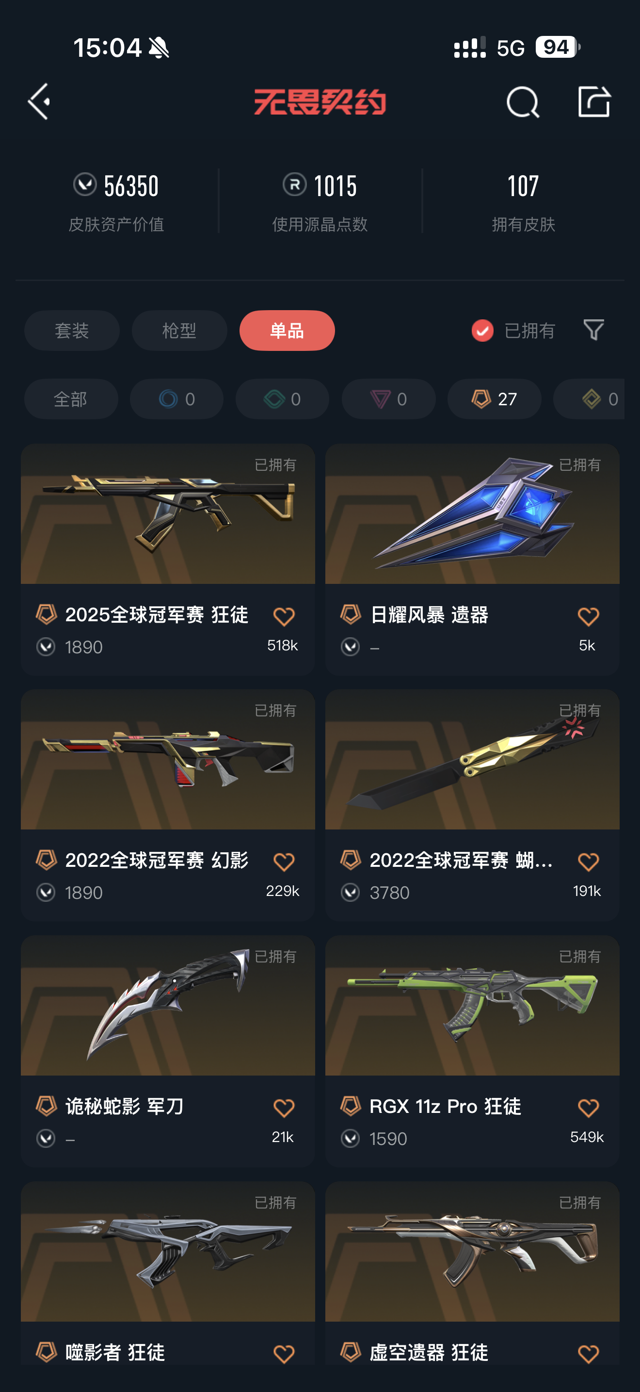 帐号皮肤价值56000vp;西部未来 奥丁,黑波之刃,VCT 2025 爪刀,盖亚的复仇 狂徒,虚空遗器 狂徒,噬影者 狂徒,掠影 狂徒,