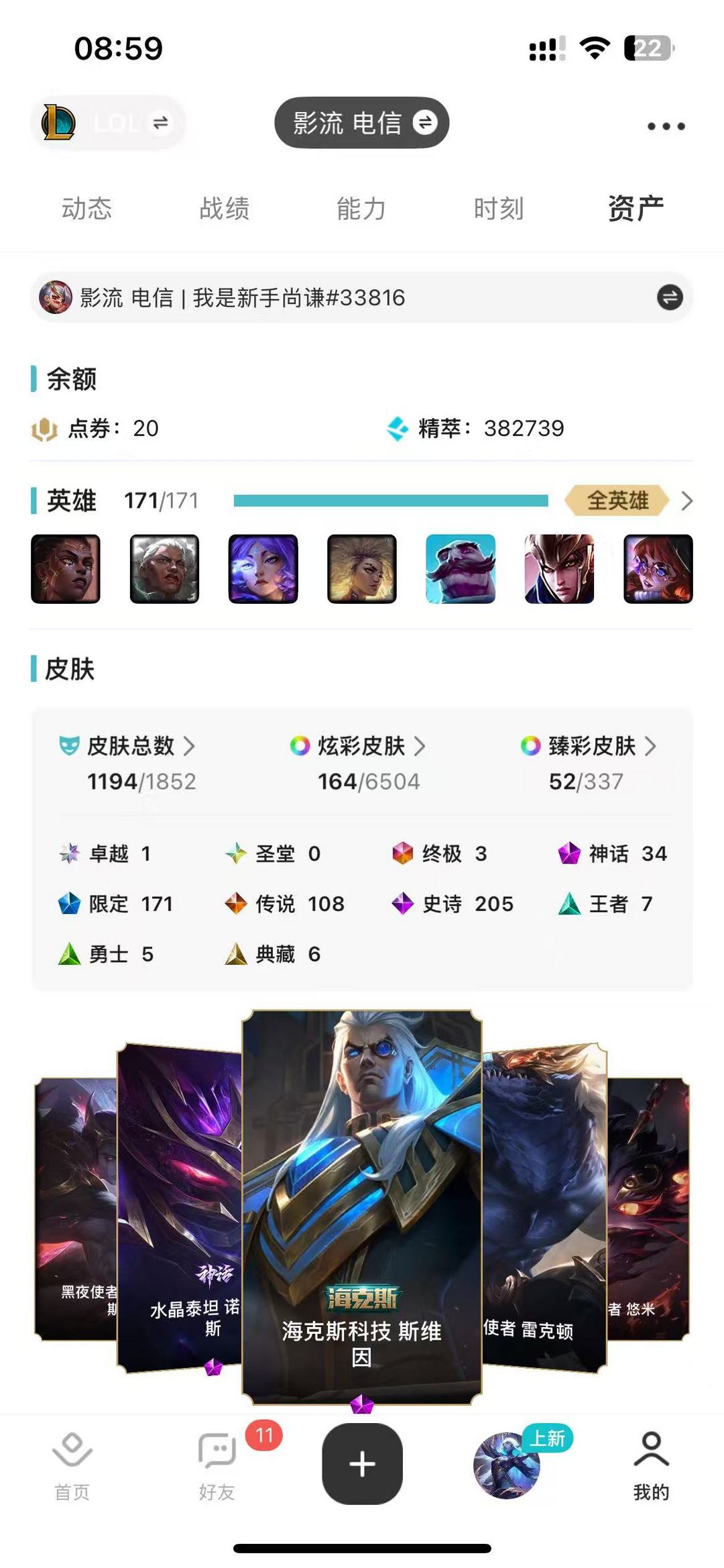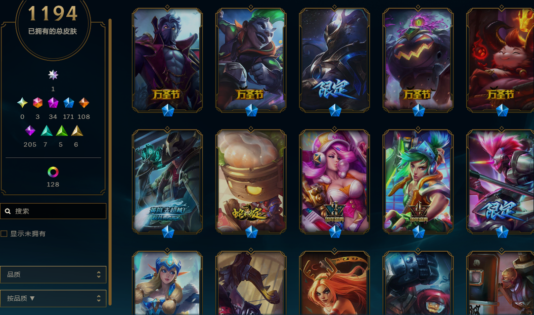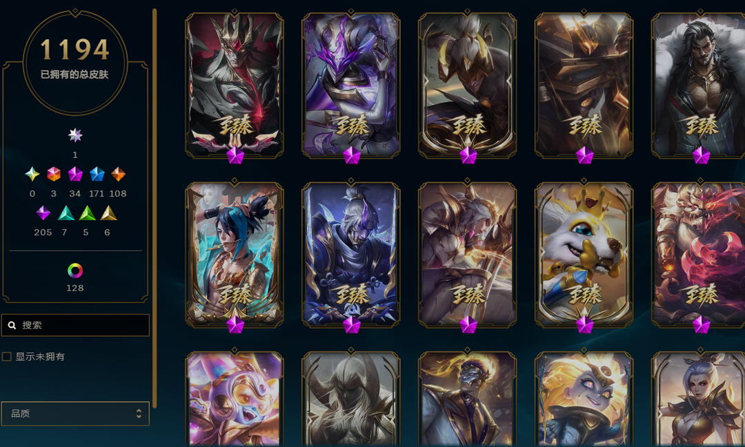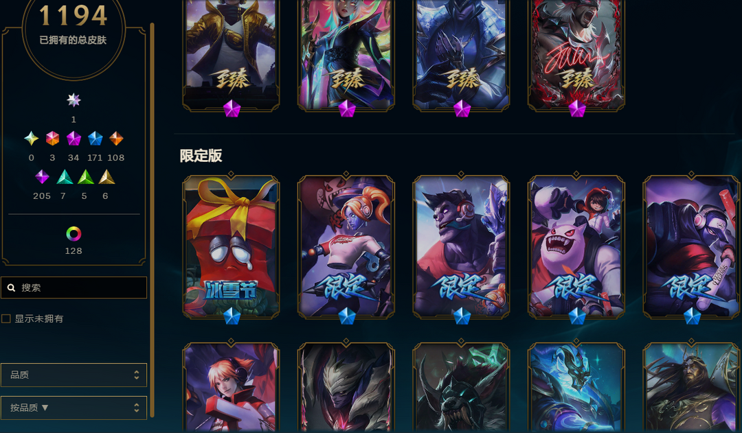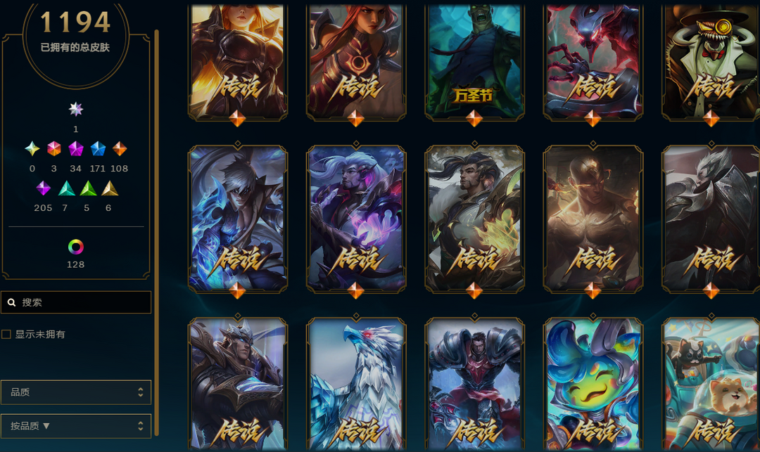 卓越1 终极3 神话34 传说108 限定171 皮肤数量1194