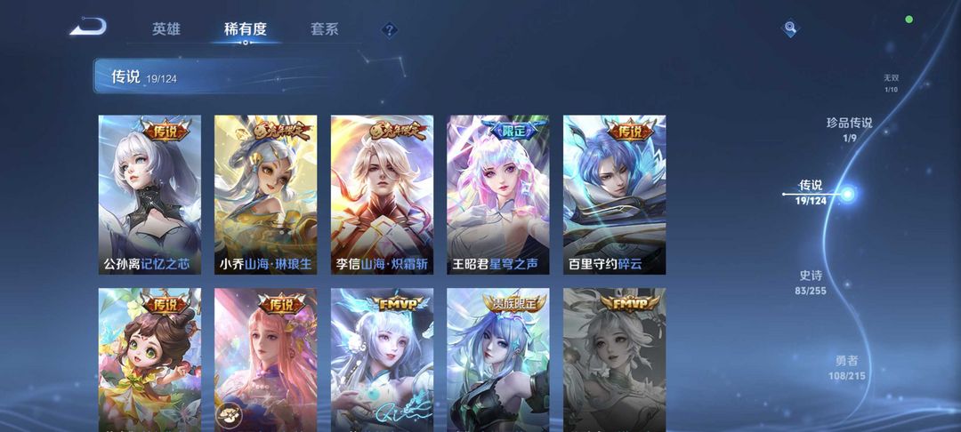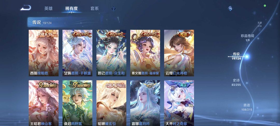 v10、509皮、刘备星传说时之思念、韩信荣耀典藏、瑶珍品传说大耳狗之梦、青丘·九尾、星域神启、画中仙、深海之息、天魔缭乱