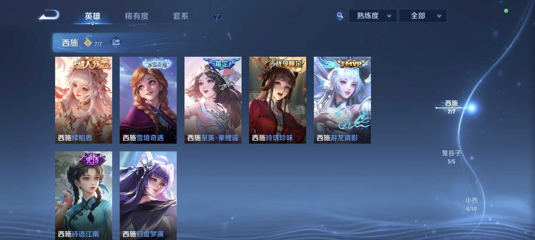 西施满皮,小乔有一个传说和无双,荣耀典藏只有一个木兰的,无禁言可以打排位和朋友一起玩