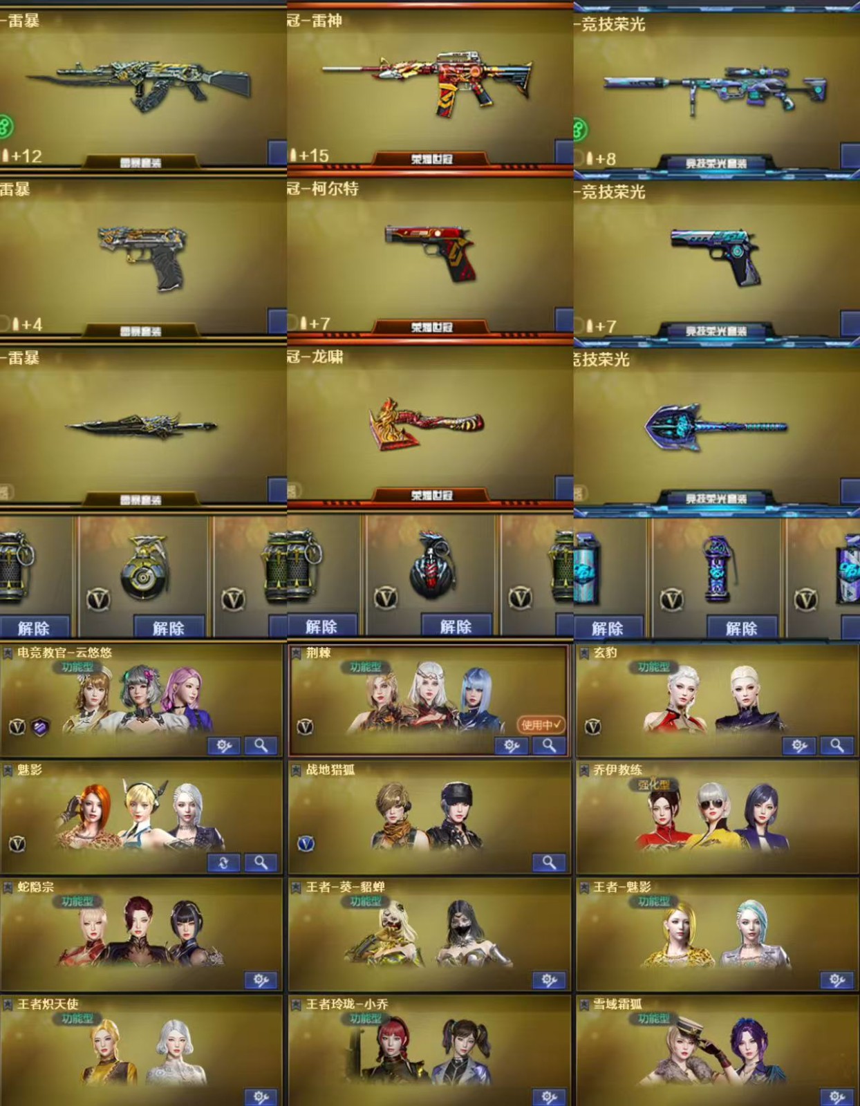 此号累充十几W➕,已备案,请一定不要开启鼠标宏等外设或外挂,不要一时冲动让大家都伤心。 订单时间快到了禁止再开排位赛,导致账号禁赛的租客将被永久拉黑!】 极品双全装✅ 爆破有:稀有荆棘角色《能发射飞弹》,幻神三件套+星神三件套+裁决三件套+qbz蔷薇三件套+qbz天罚三件套,冠军柯尔特+冠军之刃,usp冥王×4,G36C幻影,法玛斯天戎,高颜值王者凌虎/霜心,玄豹套+雷暴套+世冠套+竞技荣光套 ,VSK-94金蚀,副武器满配,手雷满配,刀战武器满配,音效卡满配等等等 生化有:蝴蝶+蛇影双骄6盘6烈,黑桃战神,鲨臂,生化手雷等等 双全装号 此号性价比很高,期望大家回头再来。 真正的爆破生化挑战全装备、保证老板满意、请老板放心租用。喜欢加个收藏!谢谢老板,感激不尽,祝老板好运一生;USP-雷暴,荣耀世冠-柯尔特,柯尔特-冠军之特,Knife-冠军之刃,电竞教官-云悠悠,RPK-盘龙,QBZ03-金色蔷薇,
