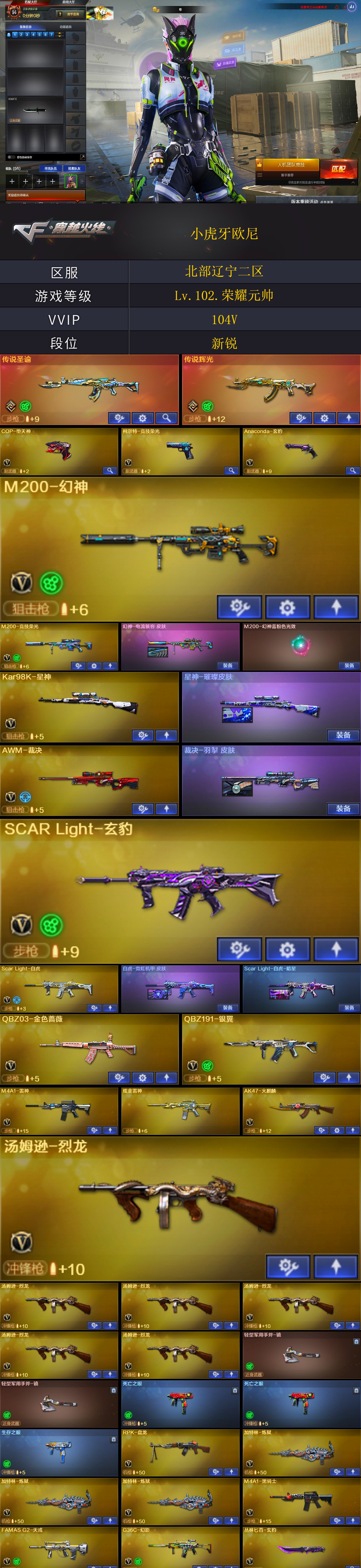 【商品标题】:北部辽宁二区-104V-可二次实名-【Lv.102.荣耀元帅】-【段位:新锐】 【稀有武器】:传说辉光/M200-幻神/Kar98K-星神/G36C-幻影/ScarLight-白虎/COP-堕天神/柯尔特-竞技荣光/修罗-古蛇迷踪/金色蔷薇-古蛇迷踪/QBZ03-金色蔷薇/AK47-火麒麟/M4A1-黑龙/M4A1-雷神/M4A1-黑骑士/AK47-无影/AK47-黑武士/Barrett-毁灭/AWM-裁决/M200-竞技荣光/RPK-盘龙/加特林-炼狱(3)/汤姆逊-烈龙(6)/AA-12-雷霆/擎天-竞技荣光 【王者武器】:王者风势/王者之怒/王者之光 【热门角色】:隼/乔伊教练/蛇隐宗/王者-零/兔囡囡/潘多拉 【热门音效卡】: 【热门皮肤】:幻神-电流骇客皮肤/裁决-羽掣皮肤/白虎-霓虹机甲 皮肤/屠龙-破浪逐光皮肤/星神-璀璨皮肤/ScarLight-白虎-暗星 【其他亮点】:异变清道夫/宙斯权杖/贝雷塔687-射手座/Glock-18-宙斯 (截图展示段位不代表实际段位,如赛季更新等不可抗拒因素发生变化,其余道具看截图或咨询客服);隼,RPK-盘龙,QBZ03-金色蔷薇,G36C-幻影,M200-幻神,Scar Light-白虎,Kar98K-星神,