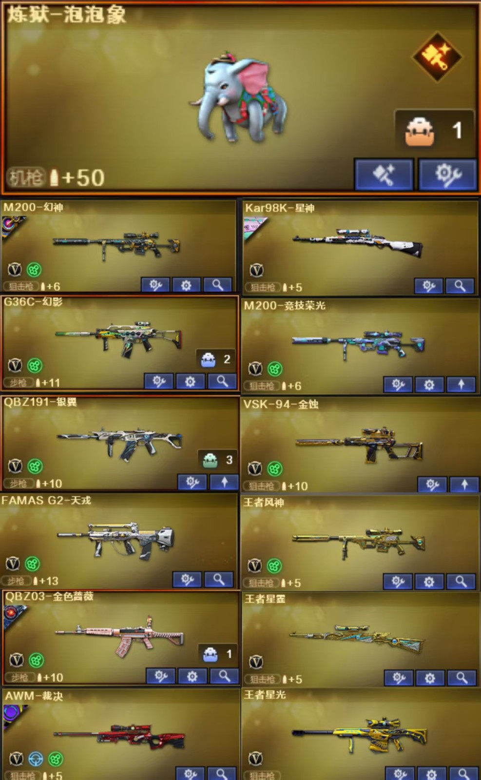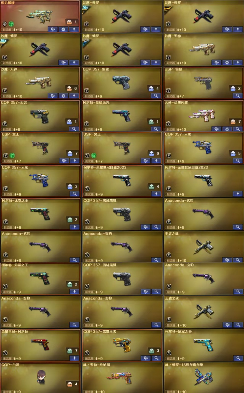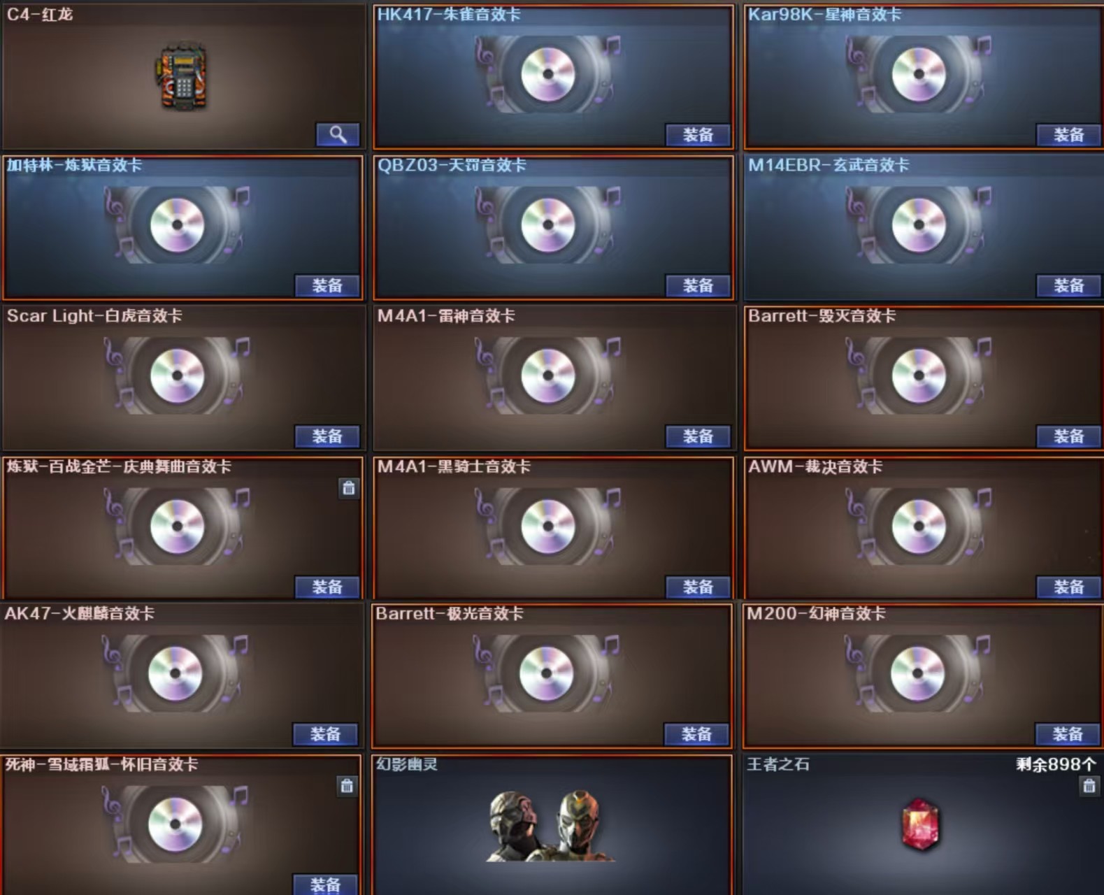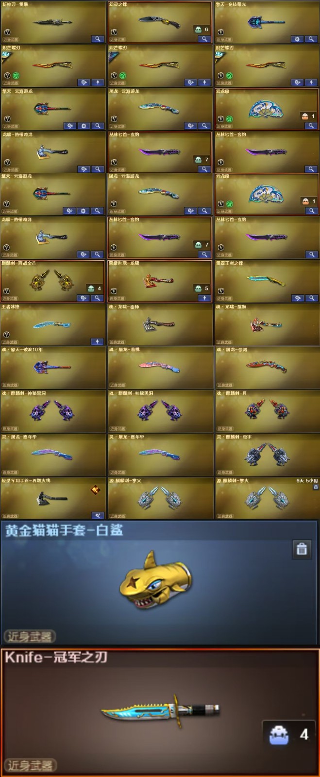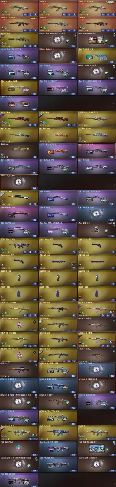 【王者武器】:【炫金毁灭-1,高爆手雷-雷霆王者-2,COP 357-雷霆王者-觉醒版-1,王者冰锋-1,QBZ-03-王者蔷薇-觉醒版-1,烟雾弹-雷霆王者-觉醒版-2,王者之心-觉醒版-1,王者之霆-1,王者星霆-1,王者之魂-觉醒版-1,闪光弹-雷霆王者-觉醒版-2,雷霆王者之锋-觉醒版-1,王者星光-1】 【英雄武器】:【M4A1-黑骑士-1,AK47-黑武士-1,屠龙-8,麒麟刺-1,AK47-火麒麟-1,AWM-天龙-2,Barrett-毁灭-1,汤姆逊-烈龙-5,RPK-盘龙-6,沙鹰-修罗-4,加特林-炼狱-3,沙鹰-天神-2,M4A1-雷神-2,M4A1-黑龙-1,9A91-烈火-1,M200-幻神-1,屠龙-云海游龙-1,M4A1-雷霆-1,USP-雷暴-1,烈龙-云海游龙-1,高爆手雷-雷暴-7,烟雾弹-雷霆-7,雷霆之怒-1,闪光弹-雷霆-7,闪光弹-雷暴-8,烟雾弹-雷暴-7,斩神刀-雷暴-1,M14EBR-玄武-1,M200-竞技荣光-1,传说夜影-1,传说辉光-1,幻灵之锋-1,擎天-竞技荣光-1,柯尔特-冠军之特-1,机械迷城-穹宇-1,柯尔特-竞技荣光-1,烟雾弹-竞技荣光-1,闪光弹-竞技荣光-1,高爆手雷-竞技荣光-1,Scar Light-白虎-1,炽芒蝶刃-3,高爆手雷-雷霆-7,AA-12-雷霆-2,QBZ03-金色蔷薇-1,SCAR Light-玄豹-1,丛林匕首-玄豹-2,Barrett-碧霄极光-1,Anaconda-玄豹-3,FAMAS G2-天戎-1,USP-冥王-2,高爆手雷-玄豹-3,闪光弹-玄豹-8,烟雾弹-玄豹-6,传说幽瞳-1,G36C-幻影-1,QBZ03-天罚-1,手雷-动感闪耀-1,天神-动感闪耀-1,擎天-云海游龙-1,柯尔特-荣耀世冠白鲨2023-2,柯尔特-无冕之王-1,超新星-热带奇洋-1,Kar98K-星神-1,黑武士-锦绣游龙-1,龙啸-热带奇洋-1,手雷-热带奇洋-1,云龙扇-1,COP 357-云龙-2,高爆手雷-云龙-1,烟雾弹-云龙-1,闪光弹-云龙-2,擎天-2,AWM-裁决-2,AK47-雷暴-1,COP 357-幻灵-1,烟雾弹-幻灵-6,传说破晓-1,荣耀世冠-柯尔特-1,荣耀世冠-火麒麟-1,荣耀世冠-雷神-1,荣耀世冠-龙啸-1,闪光弹-幻灵-5,雷霆之契-1,雷霆之锋-1,高爆手雷-幻灵-5,黑骑士-海王-1,传说灵眸-1,M4A1-猎神-1,手雷-云海游龙-1】 【装饰品】:【火麒麟-CF STAR-1,天龙-CF STAR-1,修罗-CF STAR-1,王者刀锋玩偶-1,AWM-天龙-传奇白鲨-1,炽芒蝶刃-荣耀世冠白鲨2023 皮肤-1,幻神-荣耀世冠白鲨2023 皮肤-1,毁灭-百城浙江 皮肤-1,毁灭-虹光风暴 皮肤-1,雷神-炽焰魔龙-1,AK47-火麒麟-传奇EVEN-1,金色蔷薇-纸灯龙 皮肤-1,传奇石头-横秒之巅-1,火麒麟-平天大圣-1,曼陀罗玩偶-1,火麒麟-巅峰荣耀-1,黑骑士-少林-1,黑骑士-CFS2021-1,黑骑士-冠军之势-1,Scar Light-白虎-暗星-1,白虎-电玩粉兔皮肤-1,QBZ03-荣耀世冠白鲨-1,毁灭-黑曼巴 皮肤-1,屠龙-星耀 皮肤-1,QBZ03-冠军之薇-1,毁灭-星耀 皮肤-1,雷神-神秘按键 皮肤-1,屠龙-荣耀之锋-1,雷神-荣耀之魄-1,毁灭-荣耀之怒-1,毁灭耀金皮肤-1,天罚-课桌奇兵 皮肤-1,幻神-Heartshot皮肤-1,幻神-星火小队签名臻藏版 皮肤-1,M200-幻神-荣耀世冠白鲨-1,幻神-CFS2022-1,幻神-宠儿-2021MVP-1,幻神-冠军之幻-1,星神-璀璨皮肤-1,炼狱-星空-1,屠龙-荣耀世冠AG-1,裁决-运输船 皮肤-1,修罗-百战金芒皮肤-1,裁决-流光秘银-1,M4A1-雷神-拼搏-1,QBZ03-金色蔷薇-拼搏-1,炽芒蝶刃-破浪逐光 皮肤-1,QBZ03-CFS2024 皮肤-1,QBZ03-巅峰荣耀 皮肤-1,白虎-巅峰荣耀 皮肤-1,星神-巅峰荣耀 皮肤-1,炽芒蝶刃-冠军炽芒皮肤-1,裁决-叶芒苍灵 皮肤-1,屠龙-惊鸿 皮肤-1,幻神-AG-CFPL S24冠军 皮肤-1,天启-黯钢战甲 皮肤-1,魅影玩偶-1,星神-黯钢战甲 皮肤-1,裁决-巅峰荣耀 皮肤-1,毁灭-SV-CFPLS16冠军-1,雷神-传奇N9-1,雷神-化蛇 皮肤-1,修罗-冠军之魂-1,炼狱-末日审判 皮肤-1,屠龙-巅峰荣耀 皮肤-1,屠龙-破浪逐光 皮肤-1】 【角色】:【堕天使,复仇者,雷霆-β,海豹突击队,铁骑,飞虎队,猎狐者,潘多拉,刀锋,兰,潜龙队,春,嘉年华灵狐,潘多拉-锋芒精英,游珑儿,毒蝎-X,刀锋-京韵,炫,威锋,关小雨,电竞教官-云悠悠,影豹,夜玫瑰-X,圣诞潘多拉-X,救世主-X,剑齿虎-X,猎狐者-英特尔,机械姬,代号:翼,潘多拉-甜心教官,娟娟,玄豹,紫霞,迅捷虹喵,王者潘多拉,隼,兰-限定版,麻雀,新斯沃特-英特尔,王者晴雅,王者-魅影,北极狐-X,王者-春,暗夜-X,毒蝰术士,蜀雪,传说影煞】 【道具】:【炫彩背包-1,烟雾保护头盔-1,闪光护目镜-1,防弹衣-1,防弹头盔-1,手雷包-1,C4工具钳-1,防化服-1,夺命之镰-1,变异宝贝-1,灵魂忍者-1,妖姬-1,疯狂宝贝-1,迷雾幽灵-1,生化弹匣-1,步枪弹匣-1,机枪弹匣-1,冲锋枪弹匣-1,手枪弹匣-1,彩蝶之翼-1,Barrett-毁灭音效卡-1,M4A1-雷神音效卡-1,M4A1-黑骑士音效卡-1,M200-幻神音效卡-1,云山科技背包-1,听风战术耳机-1,智眸战术目镜-1,弦波科技无线电-1,泉枢动力水壶-1,元界战术腿袋-1,QBZ03-金色蔷薇音效卡-1,Scar Light-白虎音效卡-1,枪口火焰变形-1,绿色巨人-1,黄金头骨护目镜-1,M14EBR-玄武音效卡-1,Kar98K-星神音效卡-1,QBZ03-天罚 音效卡-1,AWM-裁决音效卡-1,大圣头盔-1,全能枪王黄金面具-1】;USP-雷暴,柯尔特-无冕之王,荣耀世冠-柯尔特,柯尔特-荣耀世冠白鲨2023,柯尔特-冠军之特,炽芒蝶刃,Knife-冠军之刃,