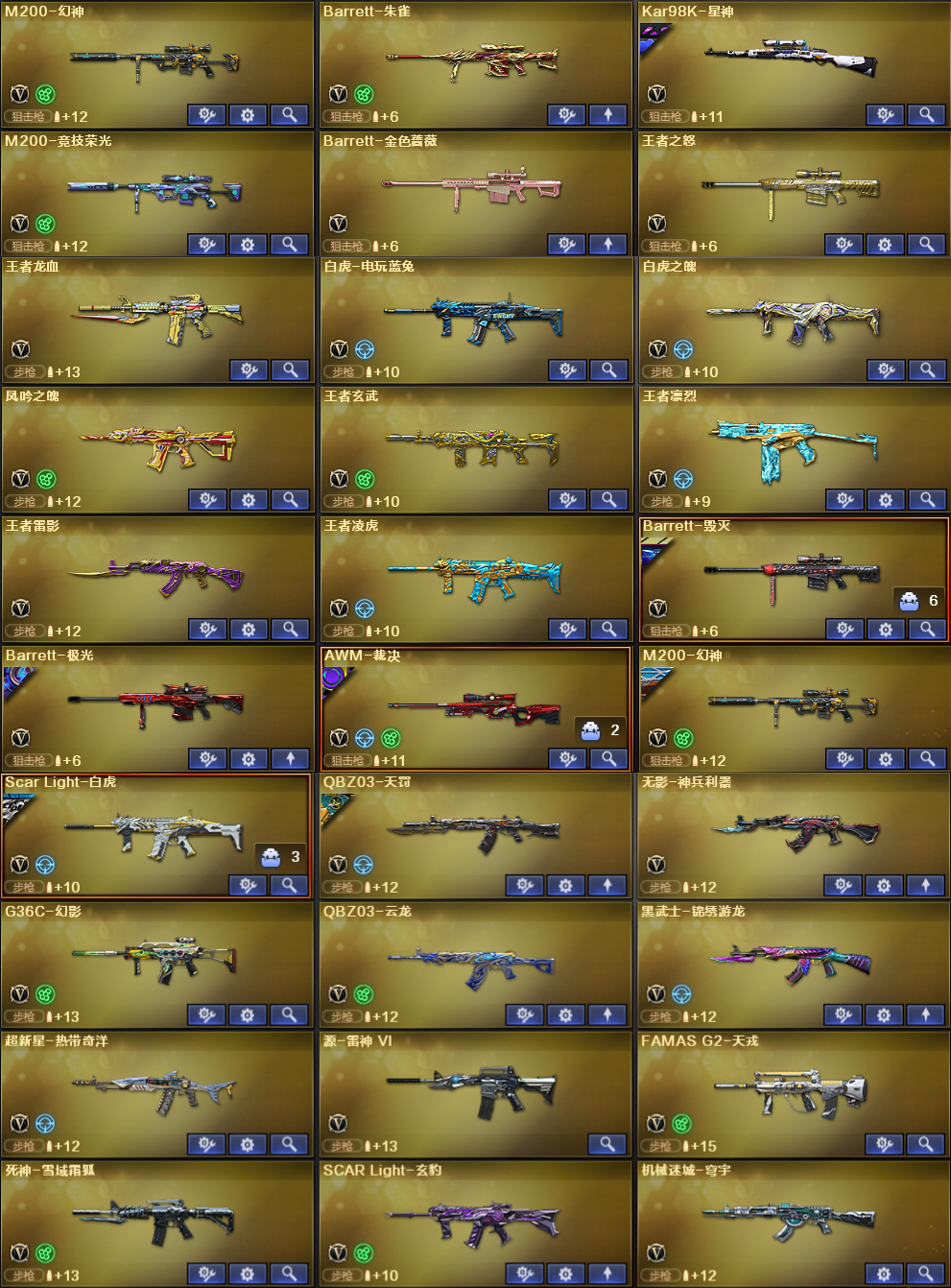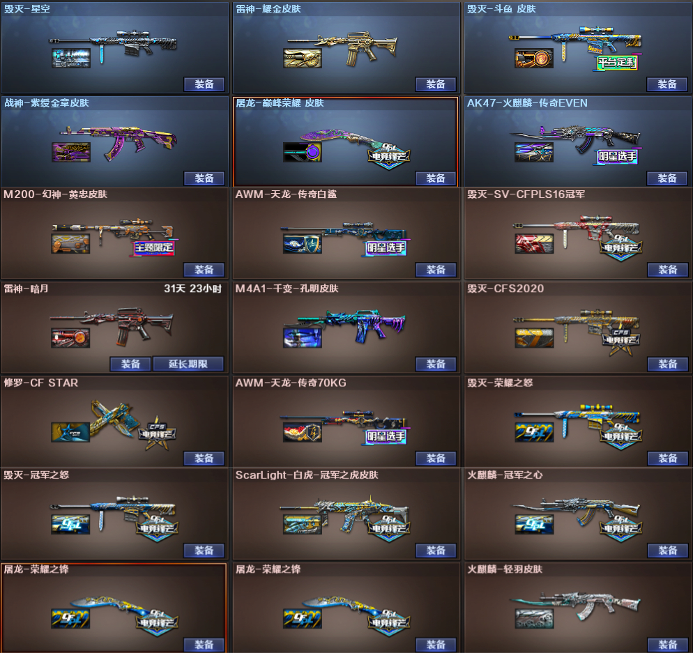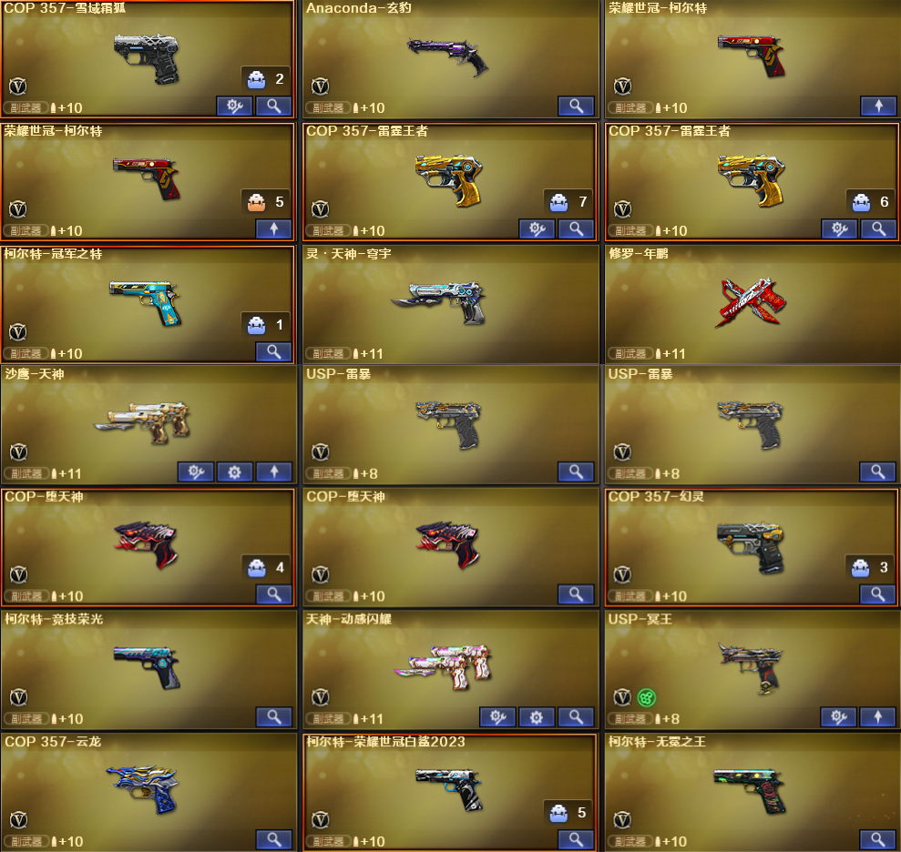 王者武器:王者凌虎;王者冰锋;王者玄武;王者之鲨-觉醒版;王者雷影;天启-悦智-觉醒版;王者凛烈;王者之魄-觉醒版;王者青龙;王者龙血-觉醒版;王者之武-觉醒版;王者之翼-觉醒版;凤吟之魄;Barrett-雷霆王者-觉醒版;高爆手雷-雷霆王者;雷霆王者之锋-觉醒版;闪光弹-雷霆王者;烟雾弹-雷霆王者;闪光弹-雷霆王者-觉醒版;COP 357-雷霆王者-觉醒版;M4A1-雷霆王者-觉醒版;烟雾弹-雷霆王者-觉醒版;高爆手雷-雷霆王者;王者之势-觉醒版;王者之锋-觉醒版;王者之怒-觉醒版 英雄武器:烟雾弹-玄豹;9A91-烈火;SCAR Light-玄豹;Anaconda-玄豹;USP-冥王;AK47-黑武士;高爆手雷-玄豹;闪光弹-玄豹;丛林匕首-玄豹;机械迷城-穹宇;FAMAS G2-天戎;QBZ03-天罚;Barrett-极光;M4A1-千变;柯尔特-荣耀世冠白鲨2023;传说幽冥;传说幽瞳;烟雾弹-夜魔;马来剑-夜魔;高爆手雷-夜魔;闪光弹-夜魔;M4A1-黑骑士;荣耀世冠-柯尔特;荣耀世冠-火麒麟;柯尔特-无冕之王;烟雾弹-云龙;高爆手雷-云龙;闪光弹-云龙;COP 357-云龙;USP-雷暴,柯尔特-无冕之王,荣耀世冠-柯尔特,柯尔特-荣耀世冠白鲨2023,传说幽冥,柯尔特-冠军之特,炽芒蝶刃,