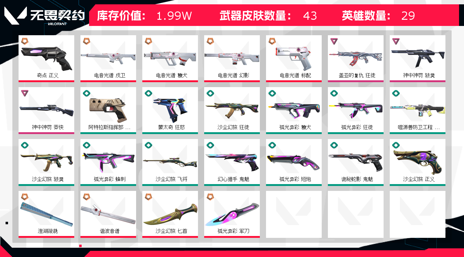 套装:电音光谱套装 套装皮肤:电音光谱幻影V4|电音光谱獠犬V4|电音光谱戍卫V4|电音光谱标配V4|谐波音谱V2| 其他皮肤:盖亚的复仇狂徒V4|耀鳞威龙狂徒V4|弧光异彩狂徒|沙尘幻旅狂徒|彩梦之城戍卫|萌彩剪影戍卫|胡桃狂想獠犬| 弧光异彩獠犬|奇点正义V4|日耀风暴正义|沙尘幻旅正义|信手涂鸦鬼魅|光导纤维鬼魅|胡桃狂想鬼魅|诡秘蛇影鬼魅|神中神罚莽侠V4|胡桃狂想冥驹|神中神罚骇灵V4|信手涂鸦骇灵|胡桃狂想蜂刺|弧光异彩蜂刺|信手涂鸦奥丁| 刀皮:弧光异彩军刀|沙尘幻旅匕首|谐波音谱V2;盖亚的复仇 狂徒,奇点 正义,