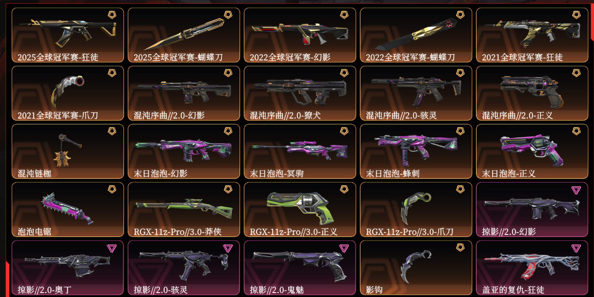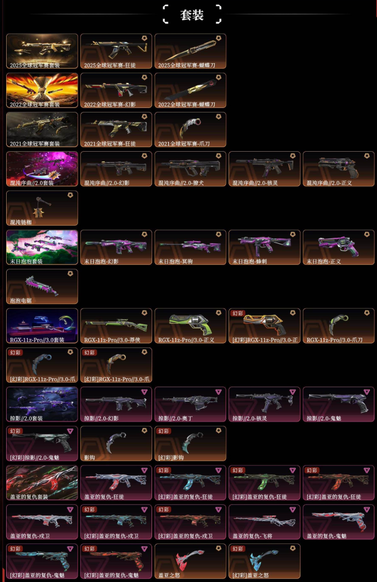 【拥有套装】掠影//2.0套装(掠影//2.0-幻影,掠影//2.0-奥丁,掠影//2.0-骇灵,掠影//2.0-鬼魅,影钩)末日泡泡套装(末日泡泡-幻影,末日泡泡-冥驹,末日泡泡-蜂刺,末日泡泡-正义,泡泡电锯)2022全球冠军赛套装(2022全球冠军赛-幻影,2022全球冠军赛-蝴蝶刀)2025全球冠军赛套装(2025全球冠军赛-狂徒,2025全球冠军赛-蝴蝶刀