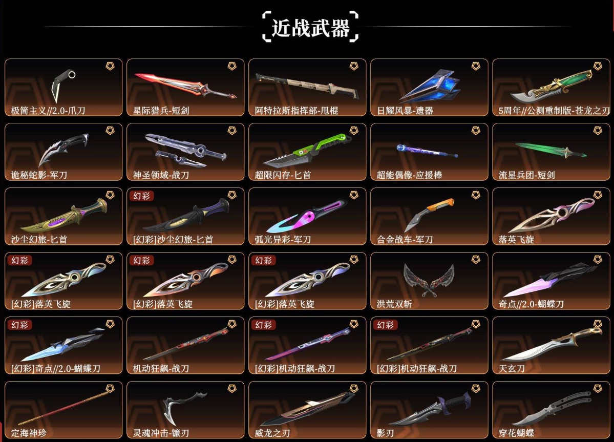 【拥有近战武器】极简主义//2.0-爪刀,星际猎兵-短剑,阿特拉斯指挥部-甩棍,日耀风暴-遗器,5周年//公测重制版-苍龙之刃,诡秘蛇影-军刀,神圣领域-战刀,超限闪存-匕首,超能偶像-应援棒,流星兵团-短剑,沙尘幻旅-匕首,弧光异彩-军刀,合金战车-军刀,落英飞旋,洪荒双斩,奇点//2.0-蝴蝶刀,机动狂飙-战刀,天玄刀,定海神珍,灵魂冲击-镰刃,威龙之刃,影刃,穿花蝴蝶,