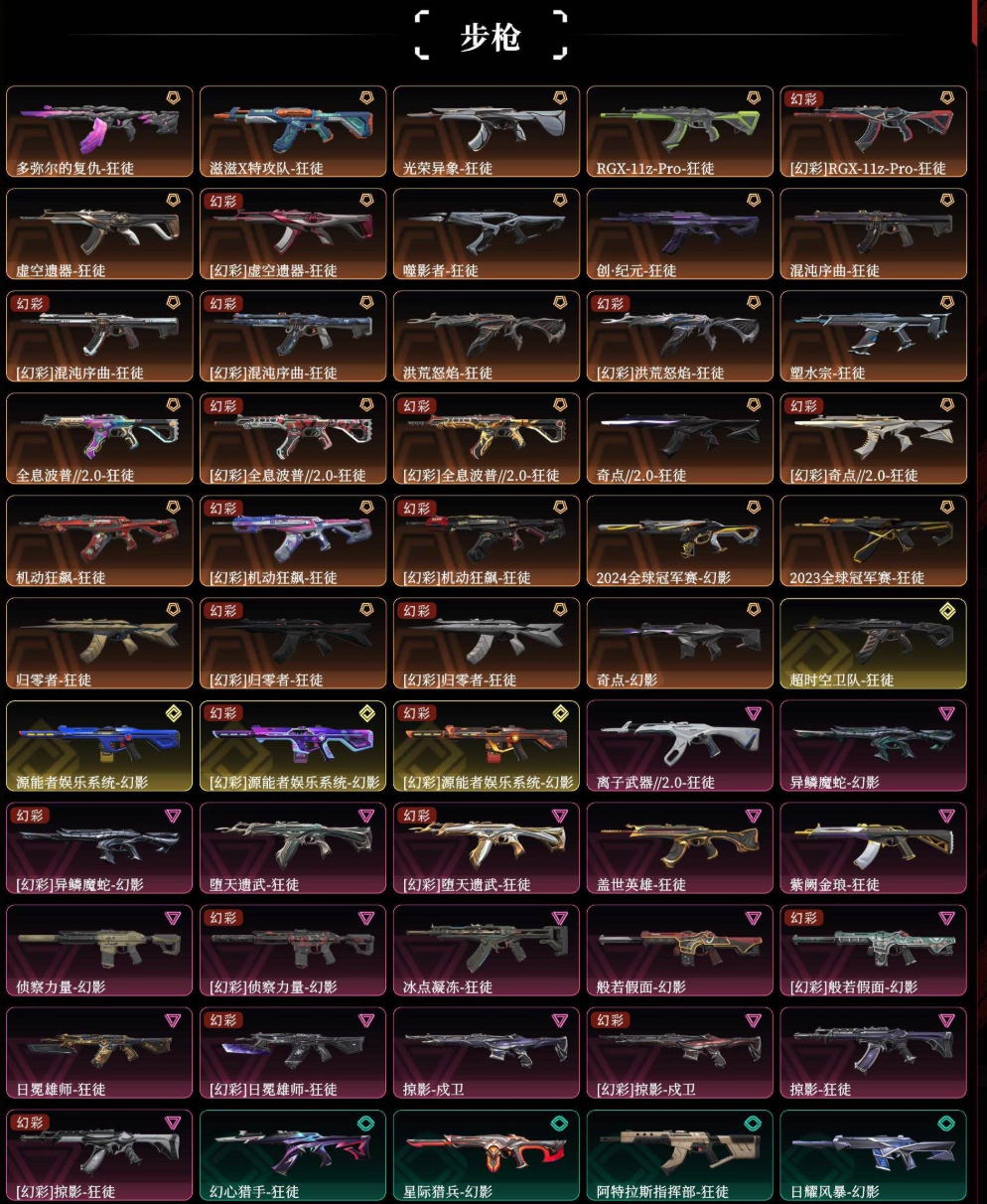 【拥有步枪】多弥尔的复仇-狂徒,滋滋X特攻队-狂徒,光荣异象-狂徒,RGX-11z-Pro-狂徒,虚空遗器-狂徒,噬影者-狂徒,创·纪元-狂徒,混沌序曲-狂徒,洪荒怒焰-狂徒,塑水宗-狂徒,全息波普//2.0-狂徒,奇点//2.0-狂徒,机动狂飙-狂徒,2024全球冠军赛-幻影,2023全球冠军赛-狂徒,归零者-狂徒,奇点-幻影,超时空卫队-狂徒,源能者娱乐系统-幻影,离子武器//2.0-狂徒,异鳞魔蛇-幻影,堕天遗武-狂徒,盖世英雄-狂徒,紫阙金琅-狂徒,侦察力量-幻影,冰点凝冻-狂徒,般若假面-幻影,日冕雄师-狂徒,掠影-戍卫,掠影-狂徒,幻心猎手-狂徒,星际猎兵-幻影,阿特拉斯指挥部-狂徒,日耀风暴-幻影,诡秘蛇影-狂徒,神圣领域-獠犬,神圣领域-幻影,超限闪存-幻影,超能偶像-戍卫,超能偶像-狂徒,流星兵团-狂徒,沙尘幻旅-狂徒,噬源兽防卫工程-幻影,弧光异彩-獠犬,弧光异彩-狂徒,合金战车-幻影,甜心猎手-戍卫,诛心猎手-獠犬,瑰梦艺语-狂徒,光环序列-戍卫,悠闲猫生-幻影,太空穿梭-戍卫,悠闲猫生-獠犬,幻语魔咒-獠犬,甜蜜战术-戍卫,末日之翼-幻影,折光棱晶-戍卫,月球哨兵-戍卫,模拟赫兹-獠犬,浮光跃金-戍卫,聚合之力-幻影,采蜜小蜂队-獠犬,战术熊与伙伴们-戍卫,萌彩剪影-戍卫,胡桃狂想-獠犬,彩梦之城-戍卫,花漾粉红-戍卫,数码咒术-獠犬,神罚-幻影,