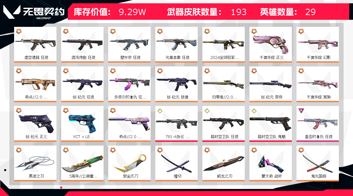 9w库存💖26VCT已购入💖多弥尔的复仇ak💖超时空卫队鬼魅💖创纪元全套💖奇点3.0全套