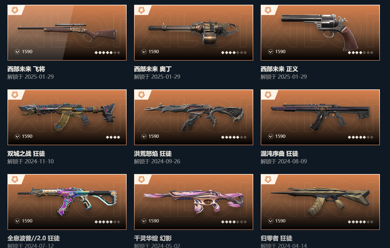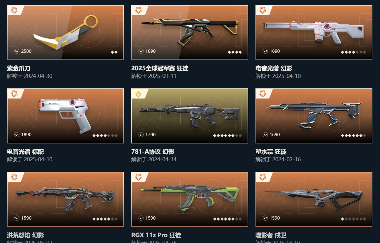黑波紫金25爪25冠军噬影者虚空西部恶魔双城掠影威龙套显卡流脓混沌塑水弃王20把狂徒电影莲花侦察幻影25爪;西部未来 奥丁,黑波之刃,紫金爪刀,威龙之刃,VCT 2025 爪刀,盖亚的复仇 狂徒,虚空遗器 狂徒,