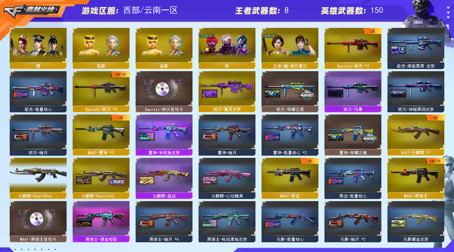 【亮点解析 传说角色 幻神3皮 生化高配 】【四防传说影煞】【m200幻神+传奇欧欧+曹操+女团】【m200竞技荣光套+四防云悠悠】【王者幻神 王者星神 】【6烈龙 盘龙*4 炼狱*2+钟馗 炽芒蝶刃+荣耀世冠白鲨2023 死亡之眼 】【scar白虎】【qbz金色蔷薇+女团】【hk417朱雀】【火麒麟+女团】【黑龙】【雷神+女团+十周年+荣耀之魄】【黑骑士+卡】【毁灭+卡+荣耀之怒】【极光】【裁决】 【武器:武圣 青龙 雷霆 王者之影 王者之魄 王者之幻 白虎电玩蓝兔 】 【13手枪:修罗*6 武圣 天神 雷霆 竞技荣光*3】 【18刀具:屠龙*4 龙啸*3 擎天*3 麒麟刺 尼泊尔雷霆 麒麟刺堕天神 竞技荣光*3 龙啸 】 【14雷套:雷霆雷*7 竞技荣光雷*7】 【小人枪:朱雀蛇隐宗 】 【音效卡:黑骑士音效卡 毁灭音效卡】 【四防角色:云悠悠 隐 王者晴雅】;炽芒蝶刃,传说影煞,电竞教官-云悠悠,RPK-盘龙,QBZ03-金色蔷薇,M200-幻神,Scar Light-白虎,