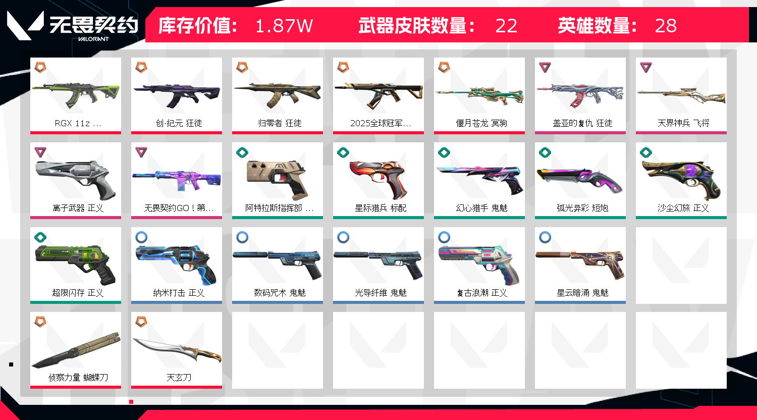 2w库✨25冠军狂徒✨天玄刀✨苍龙冥狙✨蝴蝶刀✨显卡狂徒✨离子正义✨盖亚狂徒✨归零狂徒✨