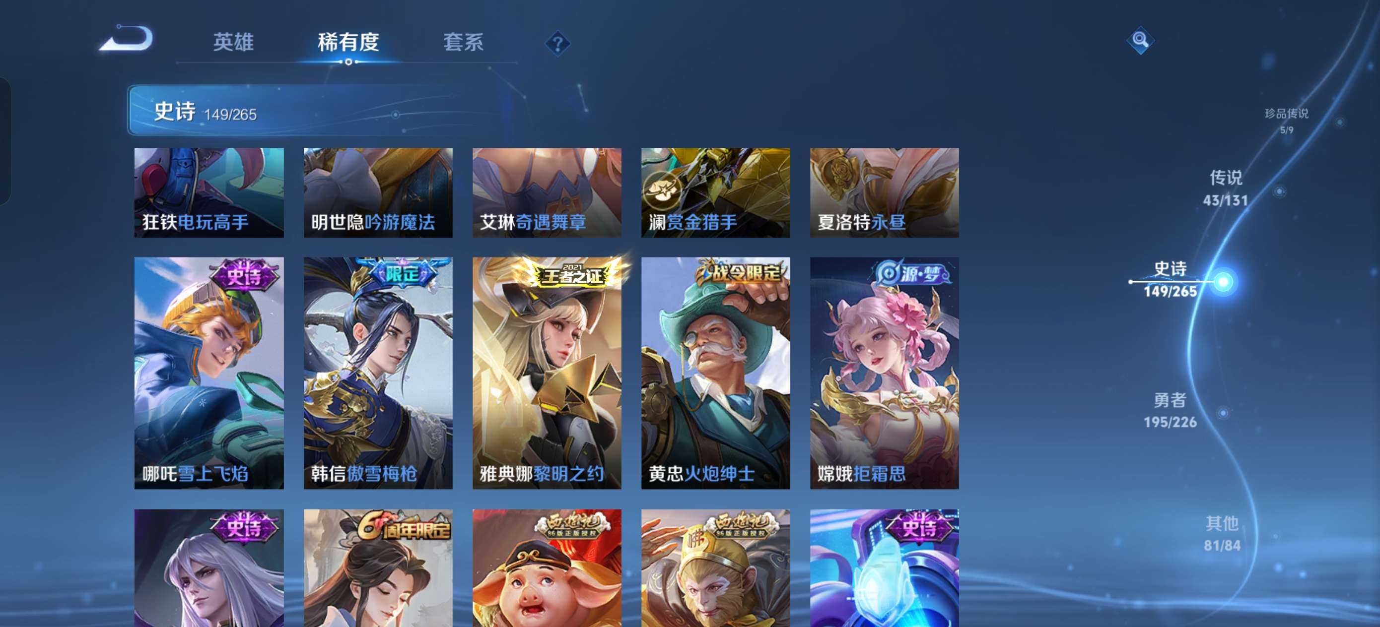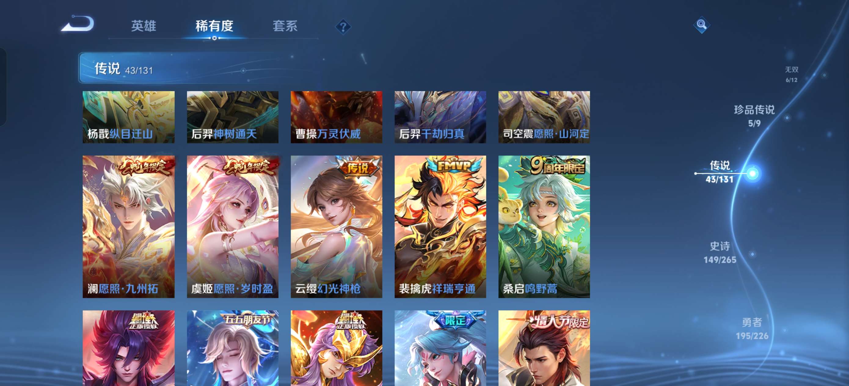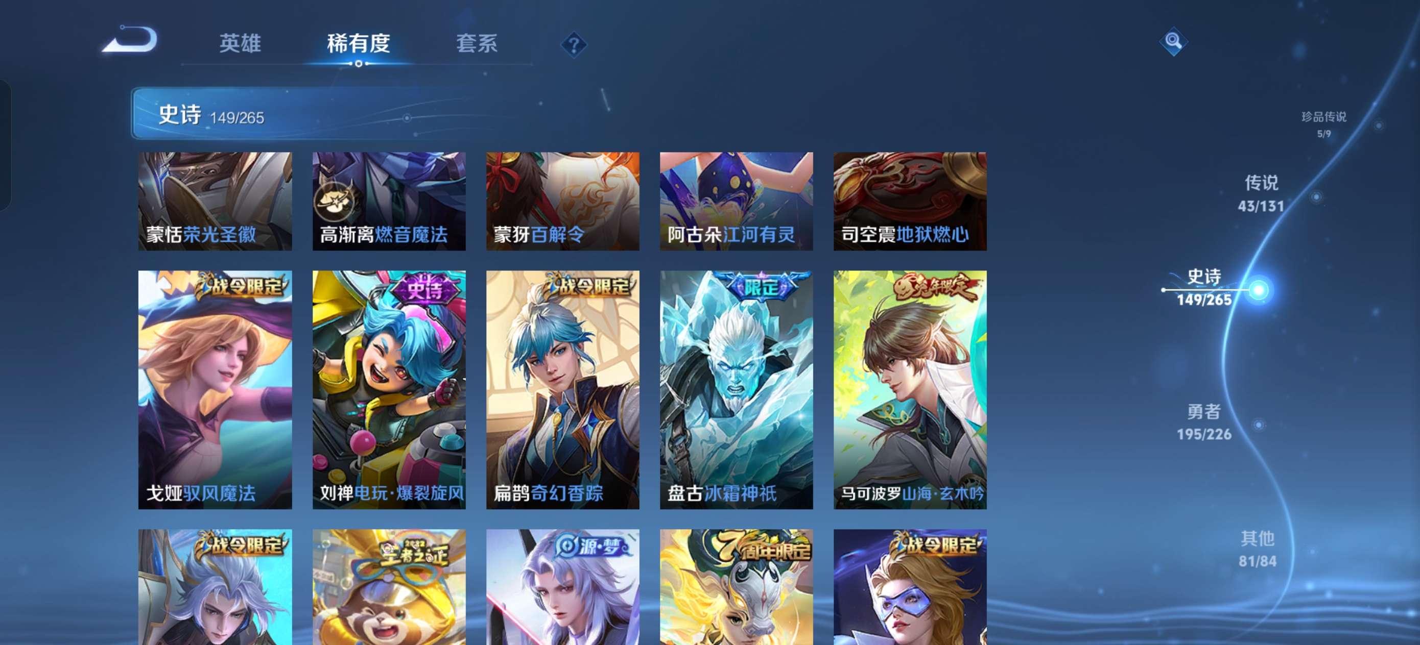 上不去看最后一张图贵族10,695皮伽罗典藏124传说,7无双,7珍品,群星魔术团,落雪白狼,龙年全满,曦炫引,战鼓燎原时之奇旅,隐龙天啸,妄想实况,琥珀纪元