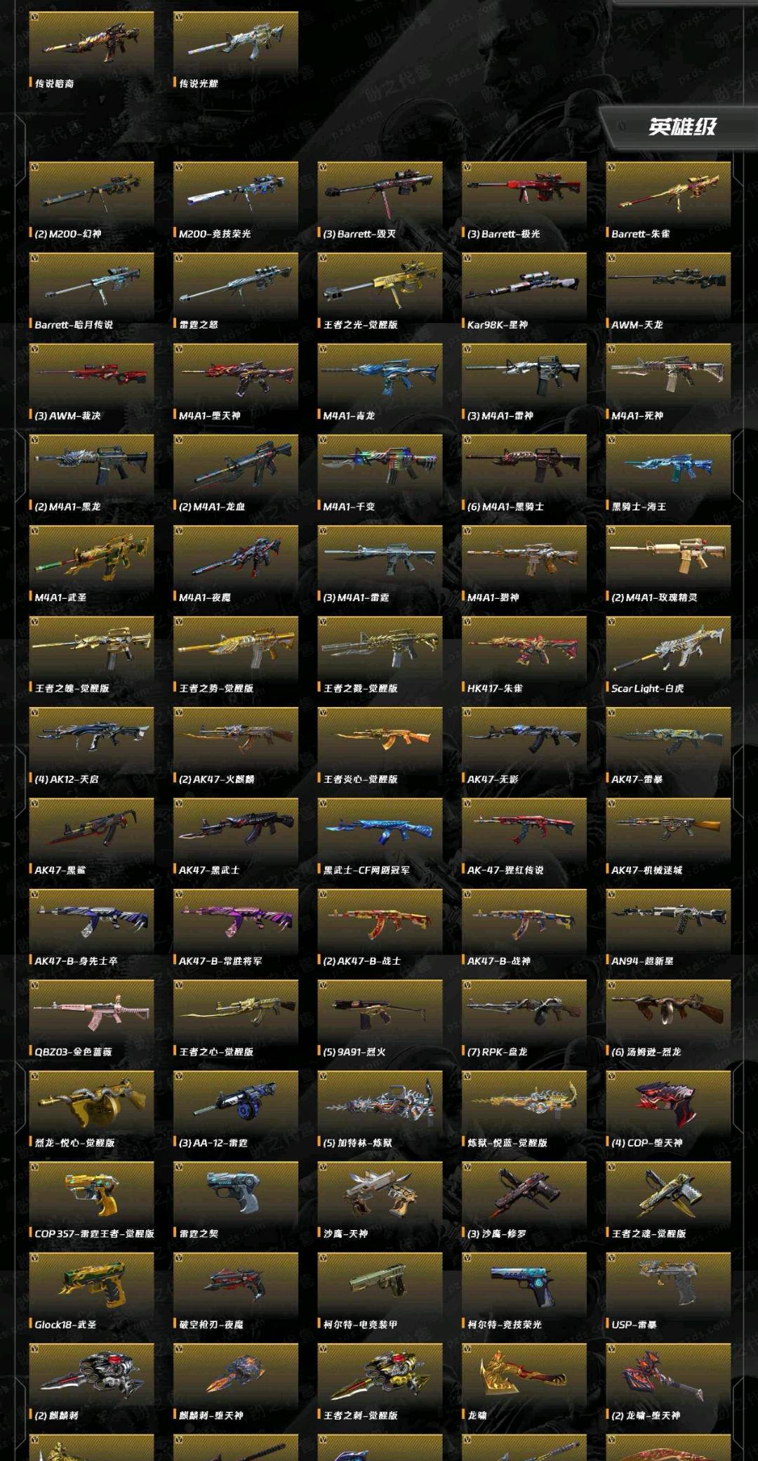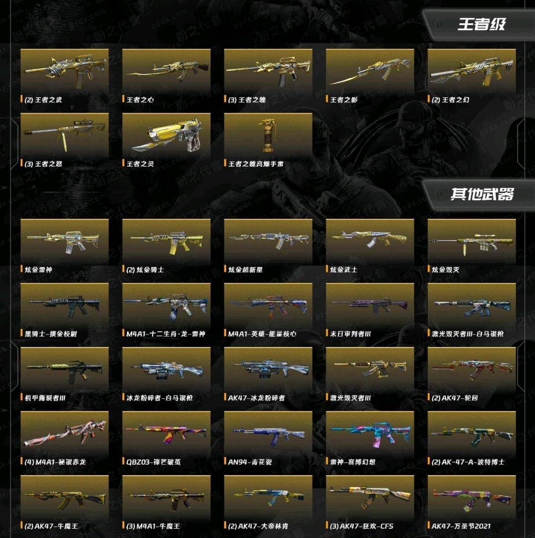 240V+16王者,6盘6烈,副武器够用,幻神三件套;USP-雷暴,电竞教官-云悠悠,RPK-盘龙,QBZ03-金色蔷薇,M200-幻神,Scar Light-白虎,Kar98K-星神,