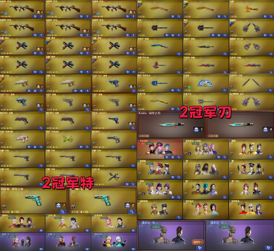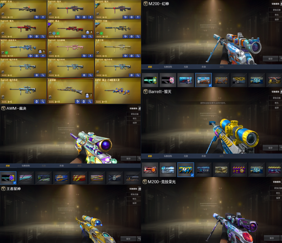 王者武器:炼狱-悦蓝-觉醒版;王者星神-觉醒版;王者之翼-觉醒版;超新星-悦享-觉醒版;王者之魂-觉醒版;玫瑰精灵-悦动;王者之锋-觉醒版;王者之击-觉醒版;王者之幻-觉醒版;王者之魄-觉醒版;炫金修罗;王者之怒-觉醒版;炫金千变;炫金黑龙;炫金天龙 英雄武器:机械迷城-穹宇;擎天;AWM-裁决;QBZ03-云龙;云龙扇;M4A1-猎神;烟雾弹-云龙;手雷-热带奇洋;AK47-B-战神;手雷-动感闪耀;天神-动感闪耀;高爆手雷-神工天巧;闪光弹-神工天巧;AK47-火麒麟;Barrett-暗月传说;AK-47-猩红传说;白虎-电玩蓝兔;柯尔特-冠军之特;Scar Light-白虎;闪光弹-竞技荣光;烟雾弹-竞技荣光;高爆手雷-竞技荣光;汤姆逊-烈龙;擎天-竞技荣光;USP-雷暴;M200-竞技荣光;柯尔特-竞技荣光;破空枪刃-夜魔;烟雾弹-夜魔;高爆手雷-夜魔;闪光弹-夜魔;马来剑-夜魔;M200-幻神;HK417-朱雀;M4A1-雷神;龙啸-堕天神;麒麟刺-堕天神;AK47-B-战士;高爆手雷-雷暴;烟雾弹-雷暴;闪光弹-雷暴;AA-12-雷霆;斩神刀-雷暴;M4A1-玫瑰精灵;AN