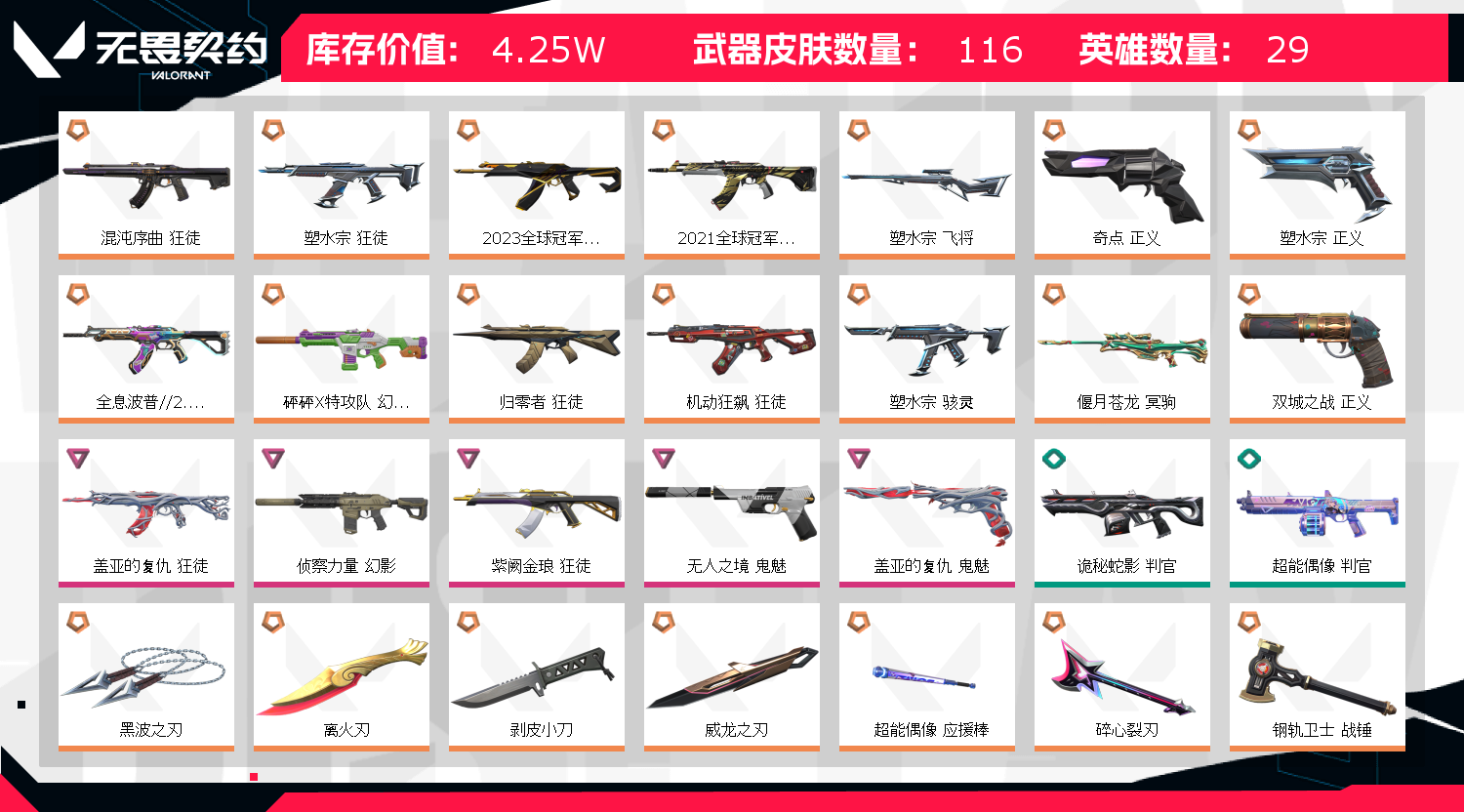 可排位 英雄28 武器皮肤数量103/塑水宗全套/离火刃/盖亚复仇/紫阙金琅/混沌/全息波普2.0/2021冠军皮/2023冠军皮等,4.2w价值;黑波之刃,离火刃,剥皮小刀,威龙之刃,盖亚的复仇 狂徒,侦察力量 幻影,紫阙金琅 狂徒,