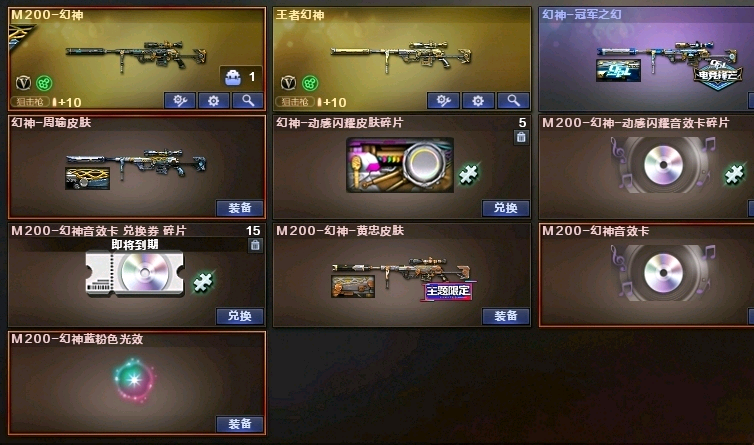 幻神3皮冠军之幻4件套❤幻神音效卡❤星神王幻❤神工天巧全套❤炽芒蝶刃破浪逐光❤荣耀世冠❤王者凤势白虎;荣耀世冠-柯尔特,炽芒蝶刃,电竞教官-云悠悠,晴雅,RPK-盘龙,QBZ03-金色蔷薇,M200-幻神,