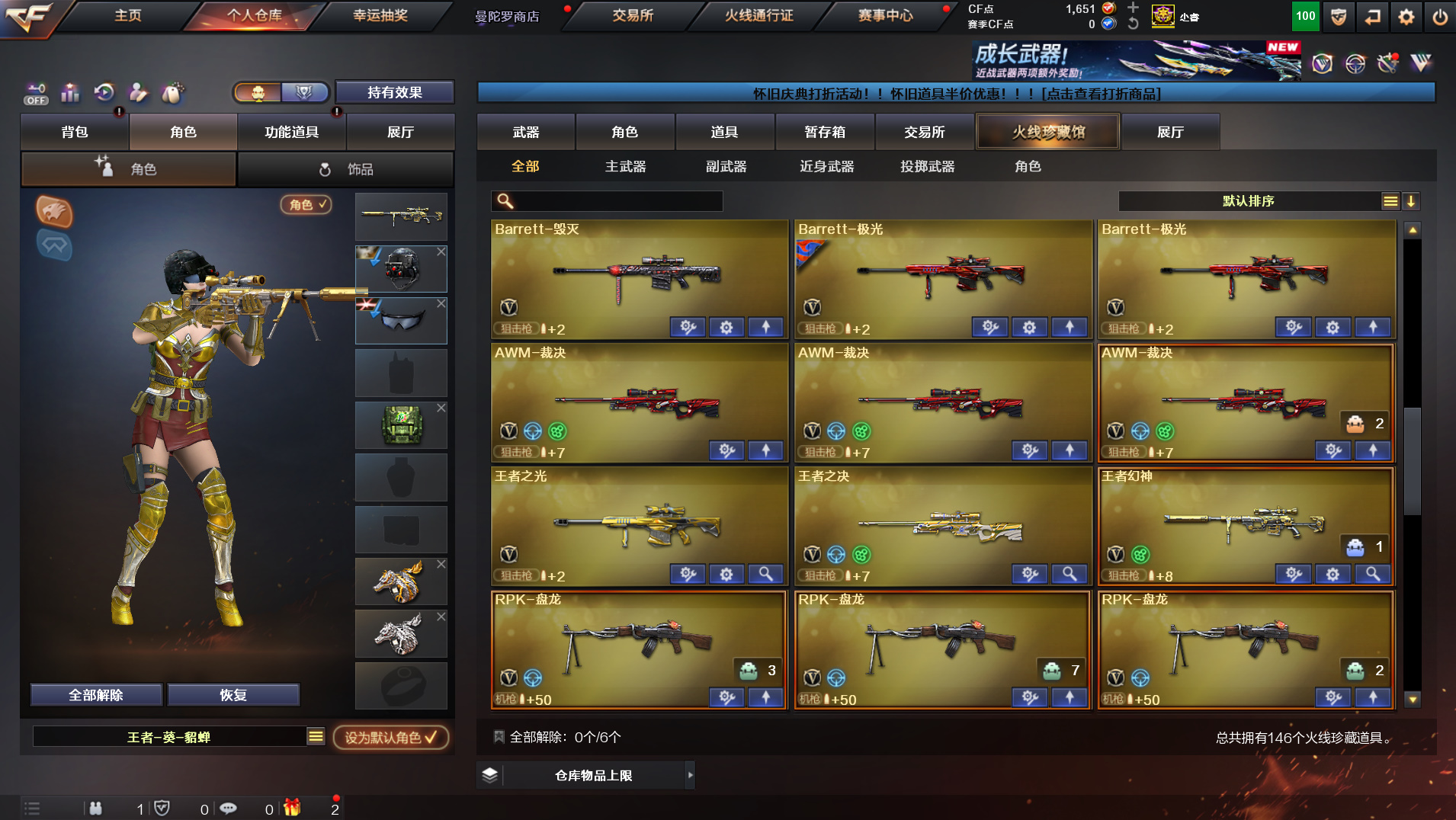 146v传说光耀+觉醒王者幻神+雷神某牙皮+生化6盘6烈7黑骑蔷薇裁决王光+毁火雷黑音赛事皮肤全;RPK-盘龙,QBZ03-金色蔷薇,