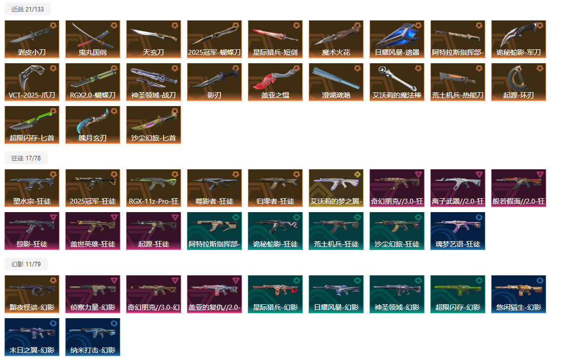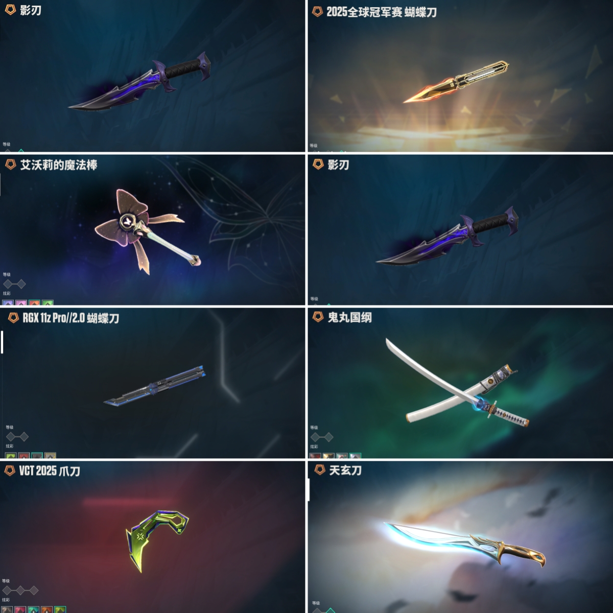 【拥有近战武器】星际猎兵-短剑,阿特拉斯指挥部-甩棍,日耀风暴-遗器,诡秘蛇影-军刀,神圣领域-战刀,VCT-2025-爪刀,荒土机兵-热能刀,超限闪存-匕首,沙尘幻旅-匕首,澄湖滟,魄月玄刃,RGX-11z-Pro//2.0-蝴蝶刀,天玄刀,剥皮小刀,盖亚之愠,艾沃莉的魔法棒,