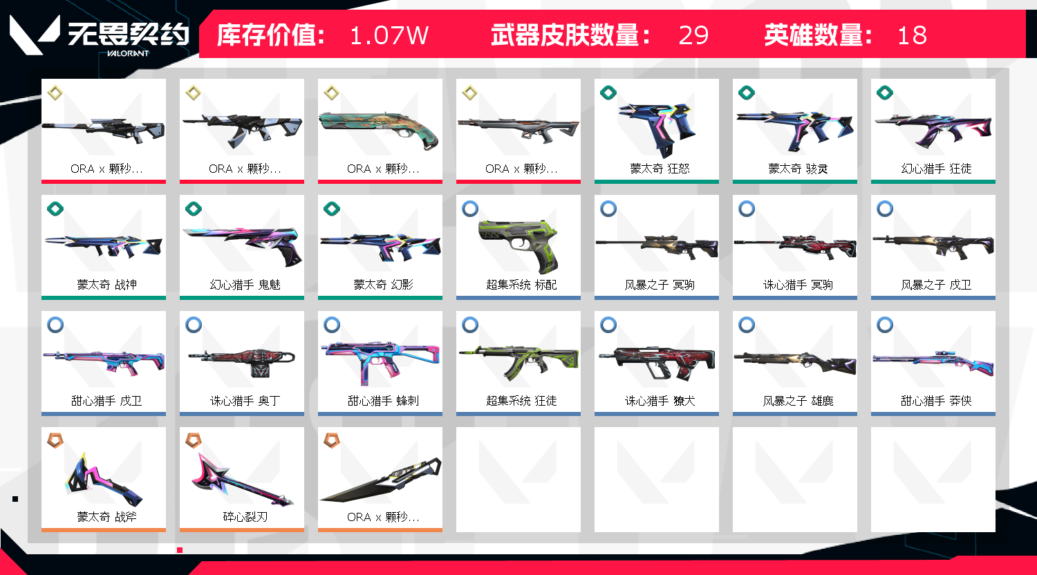 套装:ORAx颗秒套装 ORAx颗秒套装皮肤:ORA x颗秒狂徒V5|ORA x颗秒幻影V4|ORA x 颗秒冥驹V3|ORA x 颗秒正义V4|ORA x 颗秒军刀V3|ORA x 颗秒喇叭| 其他皮肤:幻心猎手狂徒|诛心猎手獠犬|诛心猎手正义|甜心猎手蜂刺|诛心猎手奥丁|甜心猎手莽侠|甜心猎手戍卫|甜心猎手幻影|碎心裂刃|幻心猎手鬼魅|;