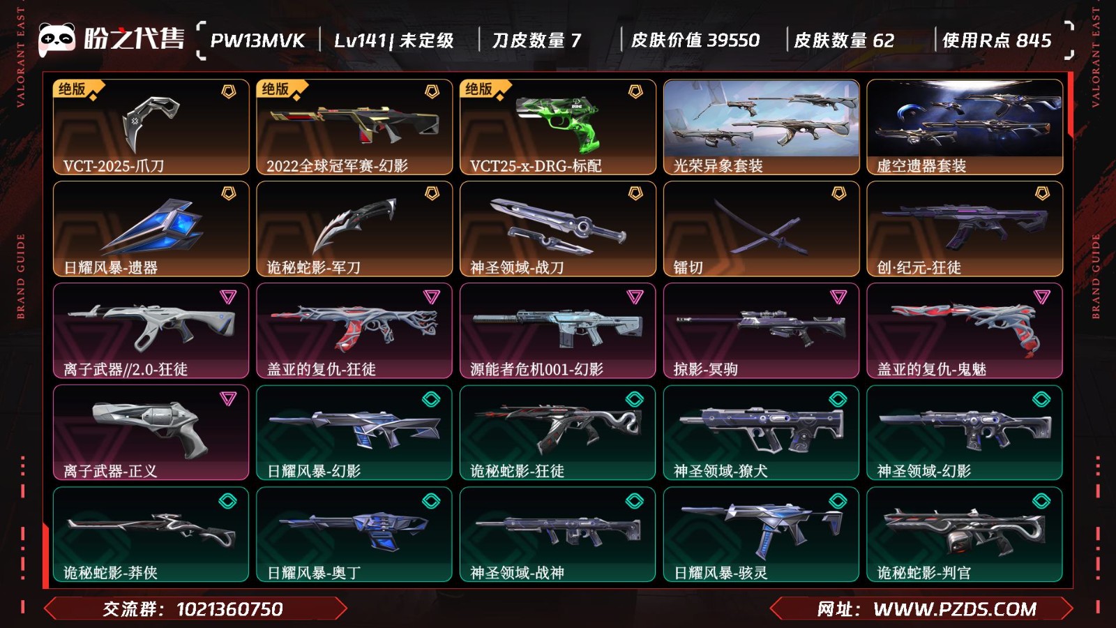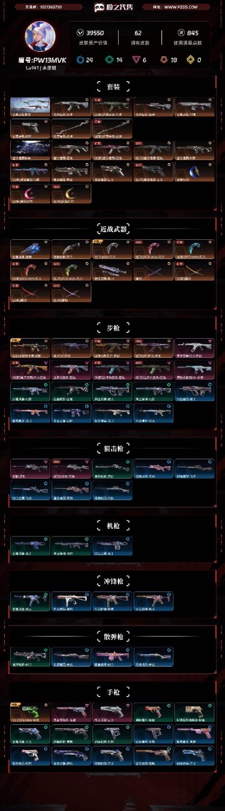【皮肤资产价值】39550 【使用R点】845 【英雄数量】19 【皮肤数量】62 【卡面数量】95 【喷漆数量】86 【挂件数量】68 【拥有套装】光荣异象套装(光荣异象-狂徒,光荣异象-冥驹,光荣异象-判官,光荣异象-标配,光荣异象-歧途)虚空遗器套装(虚空遗器-狂徒,虚空遗器-幻影,虚空遗器-判官,虚空遗器-正义,源始幻刃) 【拥有近战武器】日耀风暴-遗器,诡秘蛇影-军刀,VCT-2025-爪刀,神圣领域-战刀,镭切, 【拥有步枪】2022全球冠军赛-幻影,创·纪元-狂徒,离子武器//2.0-狂徒,盖亚的复仇-狂徒,源能者危机001-幻影,日耀风暴-幻影,诡秘蛇影-狂徒,神圣领域-獠犬,神圣领域-幻影,幻语魔咒-獠犬,甜蜜战术-戍卫,末日之翼-幻影,折光棱晶-戍卫,月球哨兵-戍卫, 【拥有狙击枪】掠影-冥驹,诡秘蛇影-莽侠,甜蜜战术-冥驹,幻语魔咒-飞将,末日之翼-飞将,星云暗涌-冥驹,月球哨兵-莽侠, 【拥有机枪】日耀风暴-奥丁,神圣领域-战神,末日之翼-奥丁, 【拥有冲锋枪】日耀风暴-骇灵,折光棱晶-蜂刺,星云暗涌-蜂刺,星云暗涌-骇灵, 【拥有霰弹枪】诡秘蛇影-判官,幻语魔咒-雄鹿,甜蜜战术-判官,月球哨兵-雄鹿, 【拥有手枪】VCT25-x-DRG-标配,盖亚的复仇-鬼魅,离子武器-正义,星际猎兵-标配,阿特拉斯指挥部-标配,日耀风暴-正义,诡秘蛇影-鬼魅,神圣领域-狂怒,幻语魔咒-狂怒,甜蜜战术-鬼魅,折光棱晶-标配,末日之翼-短炮,月球哨兵-正义,星云暗涌-鬼魅 【稀有挂件】V25第三幕铂金挂饰,钢铁之轮挂饰,迷你机甲挂饰,科尔宾之光挂饰,终章猫猫木乃伊挂饰, 【卡面信息】清风徐来卡面,情人节猎枭卡面,VCT2025CN联赛卡面,双城之战拥抱卡面,;镭切,VCT 2025 爪刀,盖亚的复仇 狂徒,虚空遗器 狂徒,光荣异象 狂徒,离子武器//2.0 狂徒,离子武器 正义,