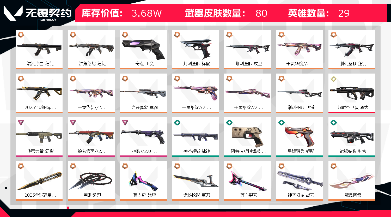 首页 > 租号大厅 > 无畏契约-wegame > wegame/wegame > 荆棘全套!可排位!莲花2.0全套混沌流脓狂25套,侦查幻影,奇点正义,掠夺鬼魅,光荣冥狙超时空獠犬
