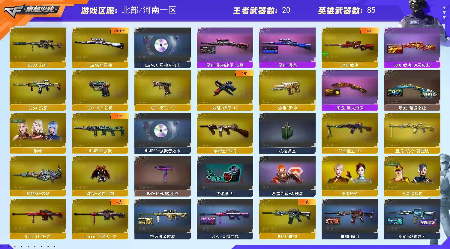 《m200幻神》《98k星神+漫游+黯钢战甲+音效卡》《裁决+凤灵》《王者风神》《cop幻灵 usp冥王 cop白鲨 1911大黄蜂》《幻灵套》《白虎之魄》《玄武》《g36幻影》《qbz天罚》《王者火魄/芳薇》《毁灭》《火麒麟》《雷神》《黑骑士》《6盘 炼狱迷你小钢》《牛牛ak》《荆棘 4防王者潘多拉 暗夜审判 女主播》《无影神兵利器 死神机甲核心 m4战神赵云》《a背包套装扩展券+b背包套装扩展券》;RPK-盘龙,G36C-幻影,M200-幻神,Kar98K-星神,