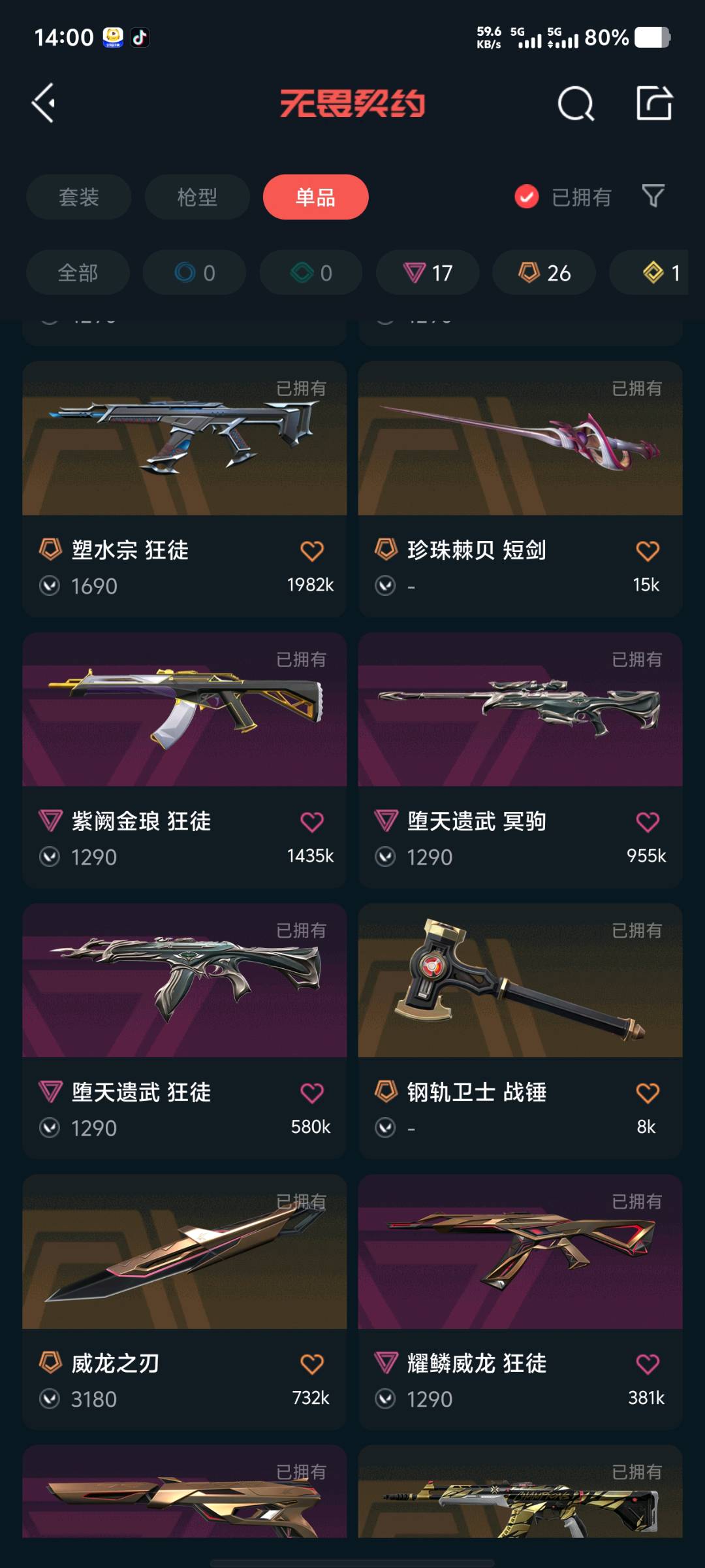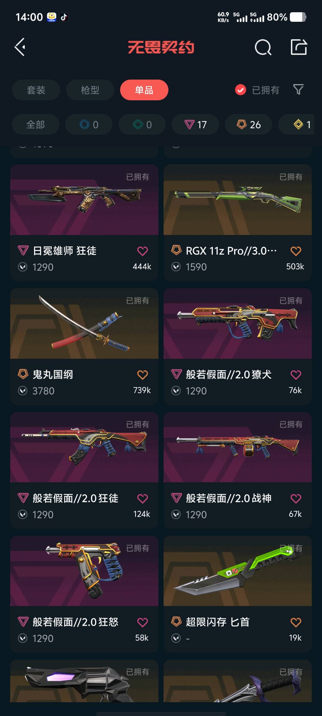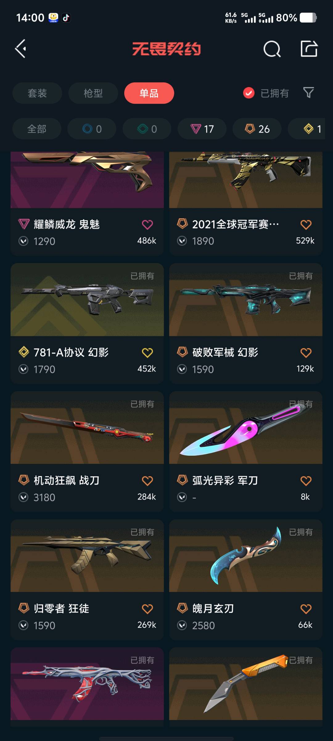 般若假面2.0套 套 绝版皮肤 近战武器-2022全球冠军赛蝴蝶刀、幻 影-2022全球冠军赛 近战武器 近战武器-沙尘幻旅匕首、近战武器-剥皮小刀、近战武器-雪季巡游、近战武器-黑波之刃、近战武器-钢轨卫士战锤、近战武器-珍珠棘贝短剑、近战武器-天御刀、近战武器-流星兵团短剑、近战武器-闪耀之星荧光棒、近战武器-超限闪存比首、近战武器-奇点2.0蝴蝶刀、近战武器-荒土机兵热能刀、近战武器-鬼丸国纲、近战武器-神圣领域战刀、近战武器-离子武器2.0爪刀、近战武器-诡秘蛇影军刀、近战武器-2022全球冠军赛蝴蝶刀 鬼魅 鬼魅-盖亚的复仇、鬼魅-胡桃狂想、鬼 魅-光导纤维、鬼魅-奇点2.0 正义 正义-塑水宗、正义-沙尘幻旅、正义-复古 浪潮、正义-西部未来 标配 标配-紫阙金琅、标配-浪漫雪国、标配-光导纤维、标配-电音光谱、标配-阿特拉斯指挥部 短炮 短炮-钢轨卫士、短炮-深海水族 狂怒 狂怒-萌彩剪影、狂怒-钢轨卫士、狂怒-珍珠棘贝、狂怒-般若假面2.0、狂怒-离子武器2.0 2024VCT手枪 标配-VCTXEDG 个;西部未来 奥丁,威龙之刃,盖亚的复仇 狂徒,掠影 戍卫,掠影 狂徒,紫阙金琅 狂徒,堕天遗武 狂徒,