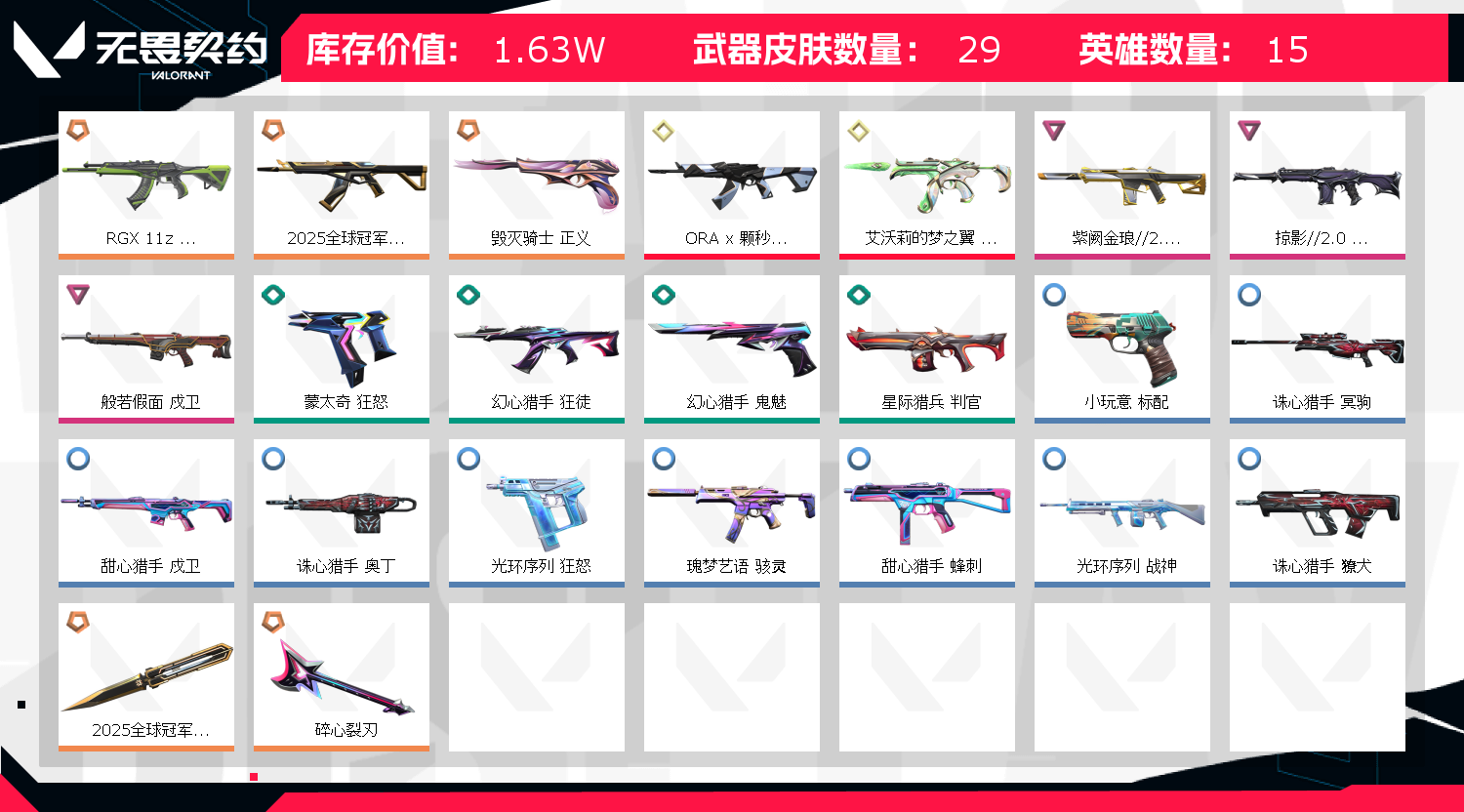 首页 > 租号大厅 > 无畏契约-wegame > wegame/wegame > 💖瓦瓦同款颗秒狂徒💖25绝版冠军套💖显卡狂徒❤️掠夺幻影紫金幻影❤️般若戍卫猫猫骇灵❤️毁灭