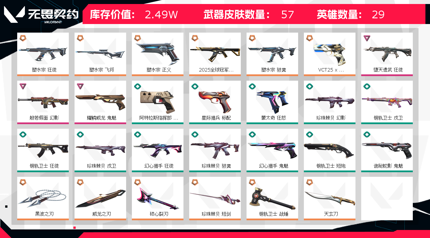 套装:塑水宗套装|耀鳞威龙套装| 塑水宗套装:塑水宗狂徒V4|塑水宗正义V4|塑水宗飞将V4|塑水宗骇灵V4|黑波之刃V2| 耀鳞威龙套装:耀鳞威龙狂徒V4|耀鳞威龙鬼魅V4|威龙之刃V2| 其他皮肤:2025冠军狂徒V4|堕天遗武狂徒V4|幻心猎手狂徒|钢轨卫士狂徒|战术小伙伴幻影|甜心猎手幻影|般若假面幻影| 珍珠棘贝幻影|珍珠棘贝戍卫|钢轨卫士戍卫|甜心猎手戍卫|诛心猎手獠犬|复古浪潮獠犬|光导纤维飞将|深海水族莽侠|甜心猎手莽侠|复古浪潮冥驹|诛心猎手冥驹|复古浪潮雄鹿|甜心猎手蜂刺|深海水族蜂刺|战术小伙伴蜂刺|珍珠棘贝骇灵|光导纤维骇灵|深海水族战神|战术小伙伴奥丁|诛心猎手奥丁|诛心猎手正义|日耀风暴正义|复古浪潮正义|光导纤维鬼魅|诡秘蛇影鬼魅|珍珠棘贝狂怒|钢轨卫士狂怒|深海水族短炮|钢轨卫士短炮|甜心猎手短炮|VCT25标配V3|;黑波之刃,威龙之刃,堕天遗武 狂徒,塑水宗 狂徒,塑水宗 飞将,塑水宗 正义,