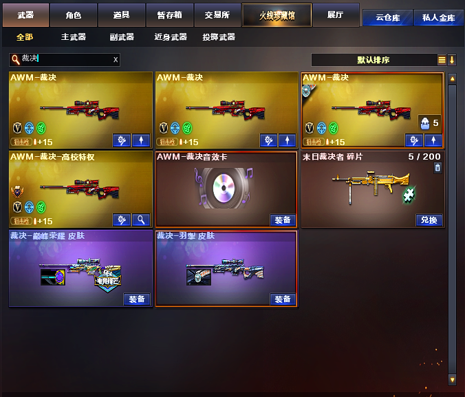 VVIP数量251 重要套装:堕天神套装/幻灵套装/荣耀世冠套装/雷霆王者套装, 重要角色:传说女帝/传说星骇/审判者/_樱/魅影/_炫/_迷迭香/_影豹/雨棠/鹰/荆棘/战地猎狐/幻面灵狐/王者复仇/王者零-传说之路/王者-葵-貂蝉/王者-魅影/王者玲珑/王者春/王者-迷迭香/王者玲珑-小乔/王者涂鸦/葵-阿尔法武装/修道士/龙儿-小淘气/代号:翼/铁扇公主/幽/职业选手/灵狐者-职业经理/莎莎/_炽天使/铁骑荣耀/零-水下丽影。 M200-幻神(2)/王者幻神-觉醒版(2) M200-幻神音效卡/HK417-朱雀音效卡/M4A1-雷神音效卡/M4A1-黑骑士音效卡/M4A1-黑龙音效卡/AK47-火麒麟音效卡/Barrett-毁灭音效卡/AWM-昌龙-怀旧音效卡/AWM-裁决音效卡/Barrett-碧霄极光音效卡/炼狱-百战金芒-庆典舞曲音效卡 蝴蝶刀 炼狱-奇幻宇宙万象+奇幻赋予卷+6盘6烈龙+斯泰尔蝴蝶+清道夫小人枪;USP-雷暴,柯尔特-无冕之王,USP-雷暴王者,荣耀世冠-柯尔特,炽芒蝶刃,传说星骇,传说女帝,