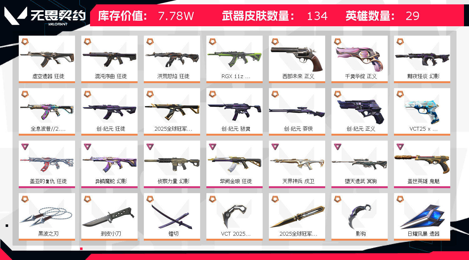 >>>>>>毁号,开挂,涉及毁坏虚拟财产罪及计算机安全罪,请文明游戏素质游戏,让我们共建美好租号平台>>>>>> 首先非常感谢您的选择!请及时续租不要挂机。快到时间了就不要再进游戏了,导致禁赛的一律拉黑,若是游戏中异地冻结,请点击解除冻结,我们会马上解冻,但是有时订单较多或系统有一定延迟,还请您耐心等待几分钟再登录,不要急着撤单 感谢!要不然下一单可能还是会冻结反而更浪费时间! 另外真诚的恳求您!想开挂自己注册个新号玩就行了,本人商户多年,所属账号已在派出所备案,经过网络财产备案价值!切勿抱有侥幸心理,一旦被封,我们直接网上就能追究,到时候后悔来不及!赚钱都不容易,感谢您的理解和支持! 注意事项: A.游戏过程中请不要恶意挂机或者不文明发言 B.恶意挂机、顶号等行为将被拉黑无法再次下单 C.进入游戏后中途请勿退出登陆,否则无法再次上号 D.部分账号由于异地登录可能会出现密码错误提示,通常再尝试5-6次后可上号 |||||||||喜欢本账号请点 ☆收藏☆ 方便下次租用,谢谢光临惠顾|||||||||;黑波之刃,剥皮小刀,镭切,VCT 2025 爪刀,盖亚的复仇 狂徒,虚空遗器 狂徒,洪荒怒焰 狂徒,