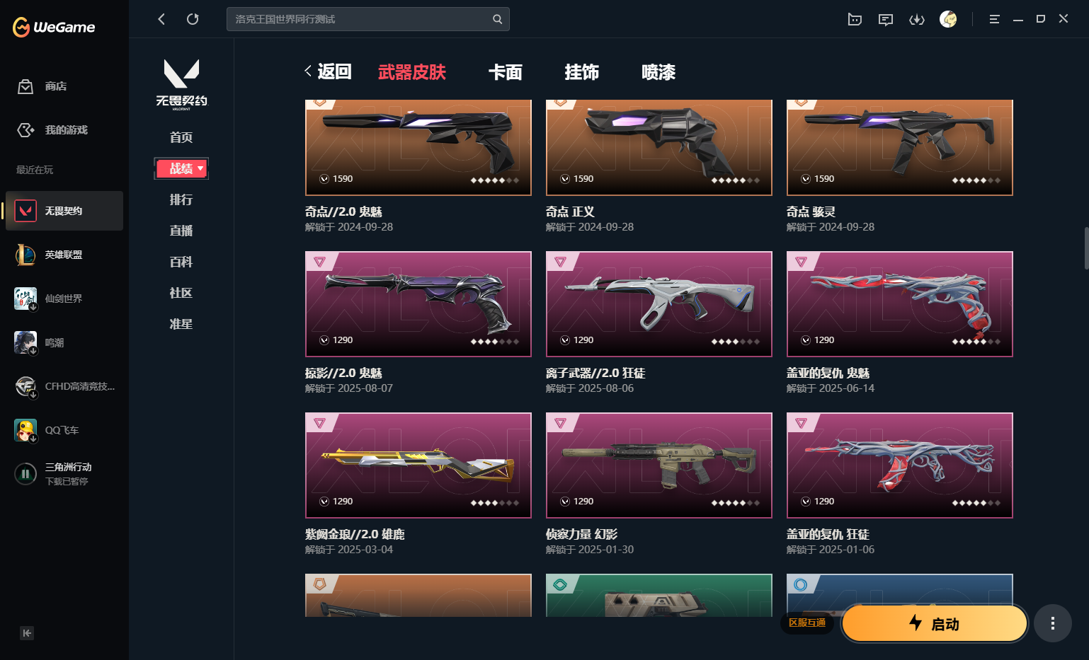 wegame无畏契约等★ 终极*35/传奇*1/卓越*6/皮肤*113/等级*218/【套装】:电音光谱套装,VCT 2025 赛季套装,创·纪元套装,奇点/2.0套装,回火礼包:奇点套装 VCT爪刀 谐波音频 雷切