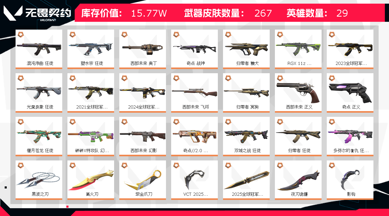 首页 > 租号大厅 > 无畏契约-wegame > wegame/wegame > 绝版离火✨16W库冻结秒解✨全冠军多新套装✨31狂徒21幻影32近战✨详情看商品信息✨喜欢点点关注