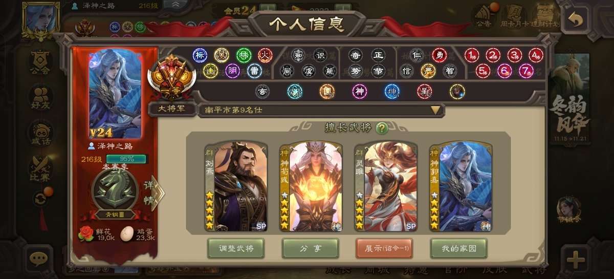 【VIP等级】VIP24[官阶]一等大将军【游戏等级]220【史诗武将数量】113【所有武将数量】490【所有皮肤数量]627【动态皮肤数量]130 【武将】至臻神郭嘉回廊神荀彧神鲁肃神华佗神甘宁神曹操神孙策神太史慈势国渊鲍三娘刘焉灵雎十常侍曹髦谋孙权谋孙策谋黄盖谋孙尚香谋诸葛亮谋刘备谋黄月英谋关羽谋夏侯氏谋曹操谋曹仁张昌蒲至臻界钟会羊徽瑜郭女王蒋干谋貂蝉杜预刘璋界沮授徐荣杨彪裴秀南华老仙星魏延…… 【动态皮肤]雄吞天下·曹操,兔年端午·许褚,逐鹿天下·曹操,明珠耀躯·甄姬,