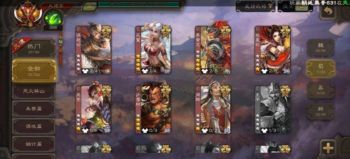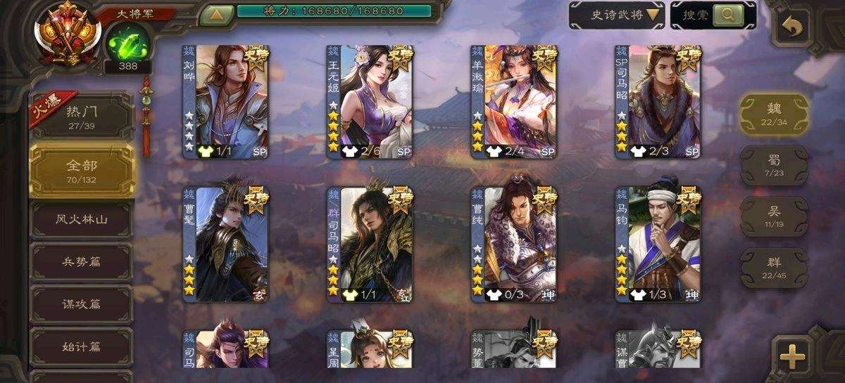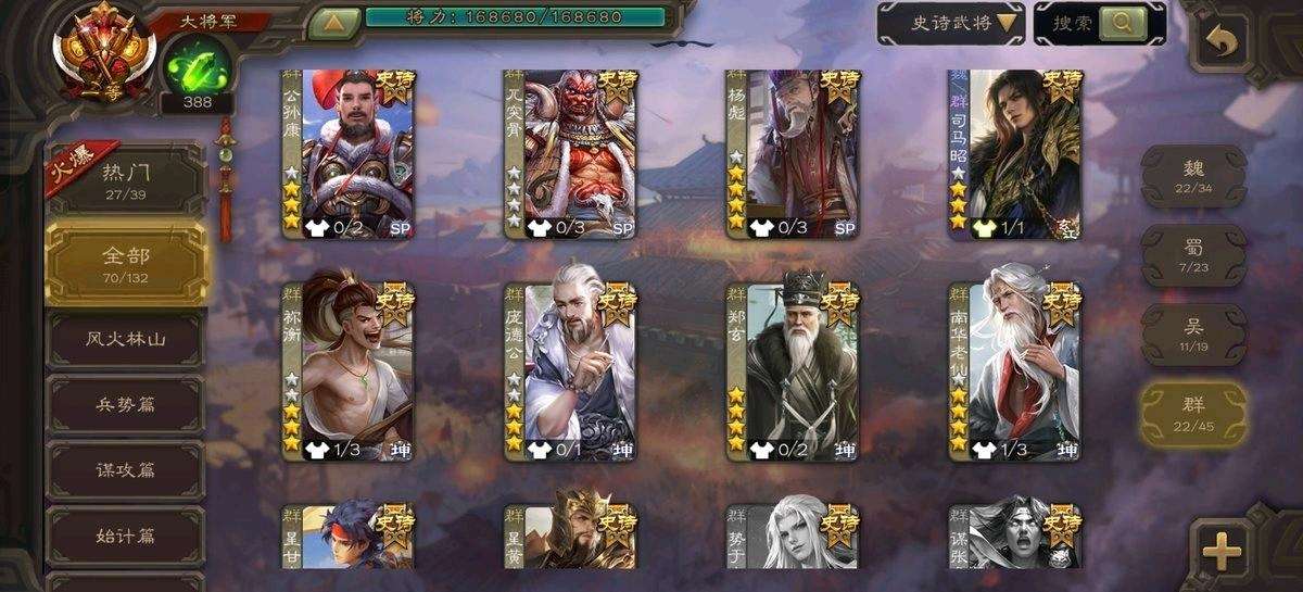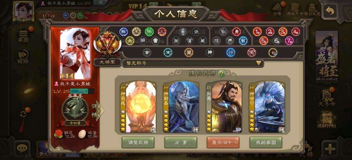 【VIP等级]VIP14[官阶]一等大将军【游戏等级]220【史诗武将数量]70【所有皮肤数量]478【动态皮肤数量】74【武将]神荀彧,神郭嘉,刘焉,神甘宁,曹髦,司马昭,神孙策,文鸯,谋黄盖,杜预,界左慈,杨彪,孙寒华