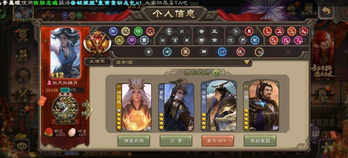 【VIP等级】VIP12[官阶]一等大将军【游戏等级]220【史诗武将数量】74【所有武将数量】473【所有皮肤数量]610【动态皮肤数量]77 【武将】动态神荀彧神鲁肃曹髦刘焉势于吉谋曹丕司马昭清河公主羊徽瑜谋关羽文鸯谋张角谋公孙瓒界沮授杜预界左慈张让审配卑弥呼裴秀祢衡郑玄星董卓星黄忠王元姬星周不疑谋黄忠傅佥周处…… 【动态皮肤】龙年七夕·孙茹,潜蛟觊天,血海岁刹,西凉雄狮·马超,以身证道·郭嘉,破军杀将,荡然由心·马良,威显官渡,才广志宏,战龙在野,虎踞江东,兔年冬日·S
